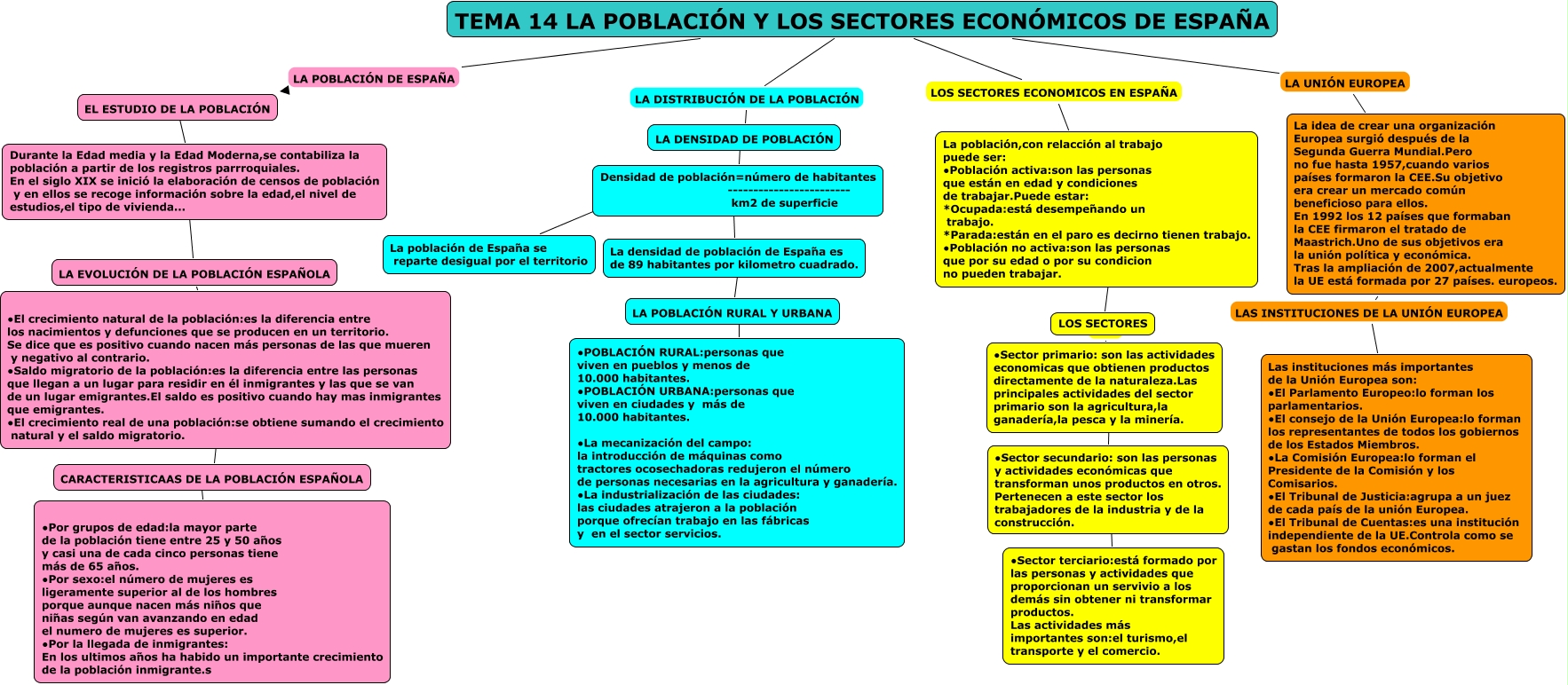natural y el saldo migratorio. </mtext> </mrow> </math> ???? CARACTERISTICAAS DE LA POBLACIÓN ESPAÑOLA, EL ESTUDIO DE LA POBLACIÓN ???? Durante la Edad media y la Edad Moderna,se contabiliza la población a partir de los registros parrroquiales. En el siglo XIX se inició la elaboración de censos de población y en ellos se recoge información sobre la edad,el nivel de estudios,el tipo de vivienda..., CARACTERISTICAAS DE LA POBLACIÓN ESPAÑOLA ???? ∙Por grupos de edad:la mayor parte de la población tiene entre 25 y 50 años y casi una de cada cinco personas tiene más de 65 años. ∙Por sexo:el número de mujeres es ligeramente superior al de los hombres porque aunque nacen más niños que niñas según van avanzando en edad el numero de mujeres es superior. ∙Por la llegada de inmigrantes: En los ultimos años ha habido un importante crecimiento de la población inmigrante.s, La idea de crear una organización Europea surgió después de la Segunda Guerra Mundial.Pero no fue hasta 1957,cuando varios países formaron la CEE.Su objetivo era crear un mercado común beneficioso para ellos. En 1992 los 12 países que formaban la CEE firmaron el tratado de Maastrich.Uno de sus objetivos era la unión política y económica. Tras la ampliación de 2007,actualmente la UE está formada por 27 países. europeos. LAS INSTITUCIONES DE LA UNIÓN EUROPEA Las instituciones más importantes de la Unión Europea son: ∙El Parlamento Europeo:lo forman los parlamentarios. ∙El consejo de la Unión Europea:lo forman los representantes de todos los gobiernos de los Estados Miembros. ∙La Comisión Europea:lo forman el Presidente de la Comisión y los Comisarios. ∙El Tribunal de Justicia:agrupa a un juez de cada país de la unión Europea. ∙El Tribunal de Cuentas:es una institución independiente de la UE.Controla como se gastan los fondos económicos., TEMA 14 LA POBLACIÓN Y LOS SECTORES ECONÓMICOS DE ESPAÑA LOS SECTORES ECONOMICOS EN ESPAÑA La población,con relacción al trabajo puede ser: ∙Población activa:son las personas que están en edad y condiciones de trabajar.Puede estar: *Ocupada:está desempeñando un trabajo. *Parada:están en el paro es decirno tienen trabajo. ∙Población no activa:son las personas que por su edad o por su condicion no pueden trabajar., Durante la Edad media y la Edad Moderna,se contabiliza la población a partir de los registros parrroquiales. En el siglo XIX se inició la elaboración de censos de población y en ellos se recoge información sobre la edad,el nivel de estudios,el tipo de vivienda... ???? LA EVOLUCIÓN DE LA POBLACIÓN ESPAÑOLA, La población,con relacción al trabajo puede ser: ∙Población activa:son las personas que están en edad y condiciones de trabajar.Puede estar: *Ocupada:está desempeñando un trabajo. *Parada:están en el paro es decirno tienen trabajo. ∙Población no activa:son las personas que por su edad o por su condicion no pueden trabajar. ???? LOS SECTORES, LA POBLACIÓN RURAL Y URBANA ???? ∙POBLACIÓN RURAL:personas que viven en pueblos y menos de 10.000 habitantes. ∙POBLACIÓN URBANA:personas que viven en ciudades y más de 10.000 habitantes. ∙La mecanización del campo: la introducción de máquinas como tractores ocosechadoras redujeron el número de personas necesarias en la agricultura y ganadería. ∙La industrialización de las ciudades: las ciudades atrajeron a la población porque ofrecían trabajo en las fábricas y en el sector servicios., La densidad de población de España es de 89 habitantes por kilometro cuadrado. ???? LA POBLACIÓN RURAL Y URBANA, Densidad de población=número de habitantes ------------------------ km2 de superficie ???? La población de España se reparte desigual por el territorio