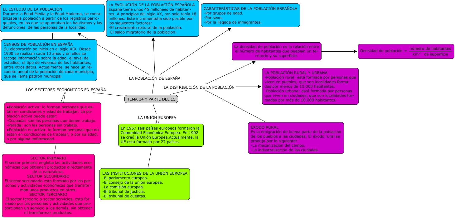 Este Cmap, tiene información relacionada con: cono tema 14 y parte del 15 alba, TEMA 14 Y PARTE DEL 15 LA UNIÓN EUROPEA En 1957 seis países europeos formaron la Comunidad Económica Europea. En 1992 se creó la Unión Europea.Actualmente, la UE está formada por 27 países., TEMA 14 Y PARTE DEL 15 LA POBLACIÓN DE ESPAÑA EL ESTUDIO DE LA POBLACIÓN Durante la Edad Media y la Edad Moderna, se conta- bilizaba la población a partir de los registros parro- quiales, en los que se apuntaban los bautismos y las defunciones de las personas de la localidad., TEMA 14 Y PARTE DEL 15 LA UNIÓN EUROPEA LAS INSTITUCIONES DE LA UNIÓN EUROPEA -El parlamento europeo. -El consejo de la unión europea. -La comisión europea. -El tribunal de justicia. -El tribunal de cuentas., TEMA 14 Y PARTE DEL 15 LOS SECTORES ECONÓMICOS EN ESPAÑA ∙Población activa: lo forman personas que es- tán en condiciones y edad de trabajar. La po- blación activa puede estar: -Ocupada: son las personas que tienen trabajo. -Parada: son las personas sin trabajo. ∙Población no activa: lo forman personas que no estan en condiciones de trabajar, o por su edad, o por alguna enfermedad., TEMA 14 Y PARTE DEL 15 LA DISTRIBUCIÓN DE LA POBLACIÓN ÉXODO RURAL Es la emigración de buena parte de la población de los pueblos a las ciudades. El éxodo rural se produjo por lo siguiente: -La mecanización del campo. -La industralización de las ciudades., TEMA 14 Y PARTE DEL 15 LA DISTRIBUCIÓN DE LA POBLACIÓN <math xmlns="http://www.w3.org/1998/Math/MathML"> <mtext> La densidad de población es la relación entre