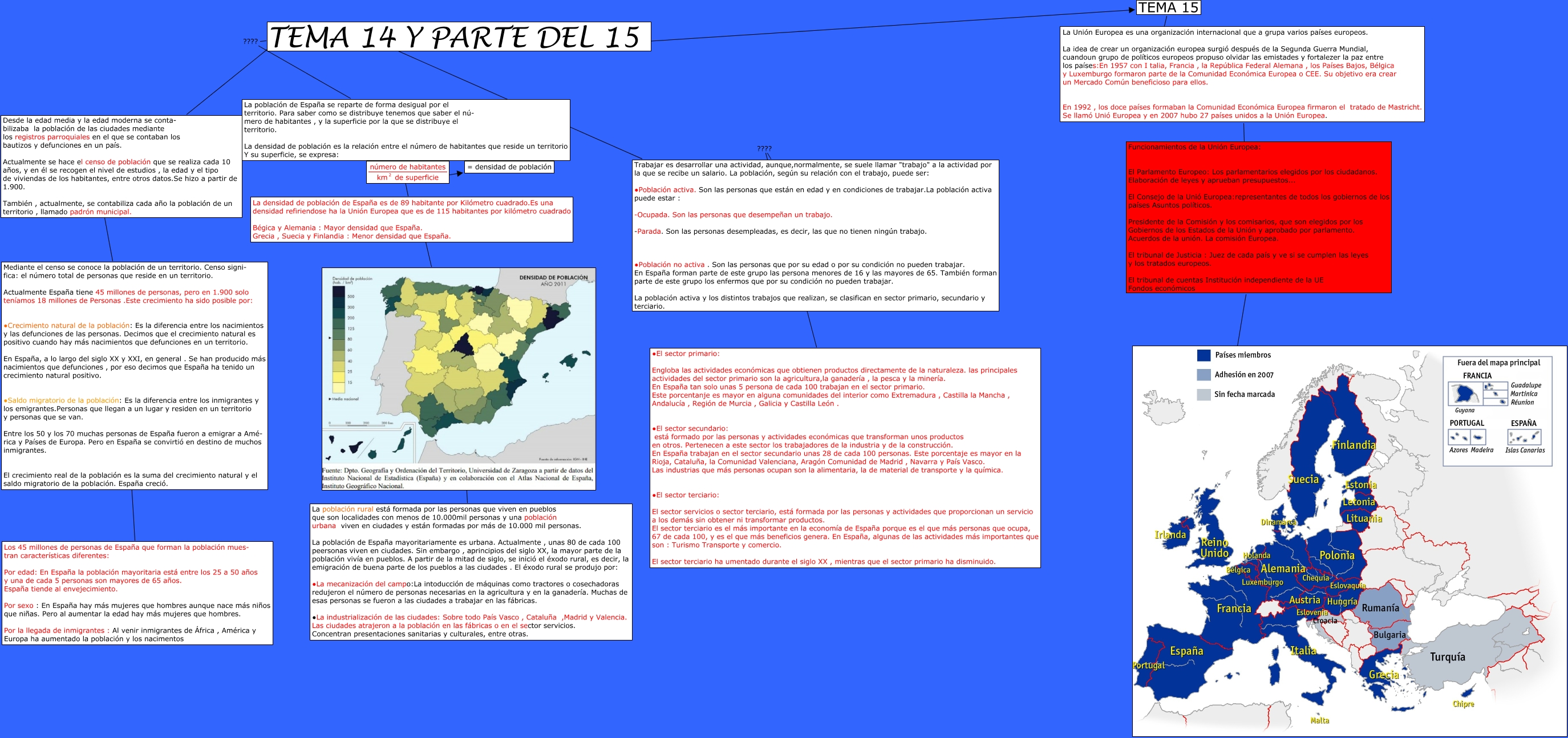Este Cmap, tiene información relacionada con: lo tengo 15 Jorge F, TEMA 14 Y PARTE DEL 15 ???? La población de España se reparte de forma desigual por el territorio. Para saber como se distribuye tenemos que saber el nú- mero de habitantes , y la superficie por la que se distribuye el territorio. La densidad de población es la relación entre el número de habitantes que reside un territorio Y su superficie, se expresa:, TEMA 14 Y PARTE DEL 15 ???? Trabajar es desarrollar una actividad, aunque,normalmente, se suele llamar "trabajo" a la actividad por la que se recibe un salario. La población, según su relación con el trabajo, puede ser: ∙Población activa. Son las personas que están en edad y en condiciones de trabajar.La población activa puede estar : -Ocupada. Son las personas que desempeñan un trabajo. -Parada. Son las personas desempleadas, es decir, las que no tienen ningún trabajo. ∙Población no activa . Son las personas que por su edad o por su condición no pueden trabajar. En España forman parte de este grupo las persona menores de 16 y las mayores de 65. También forman parte de este grupo los enfermos que por su condición no pueden trabajar. La población activa y los distintos trabajos que realizan, se clasifican en sector primario, secundario y terciario., ???? La población rural está formada por las personas que viven en pueblos que son localidades con menos de 10.000mil personas y una población urbana viven en ciudades y están formadas por más de 10.000 mil personas. La población de España mayoritariamente es urbana. Actualmente , unas 80 de cada 100 peersonas viven en ciudades. Sin embargo , aprincipios del siglo XX, la mayor parte de la población vivía en pueblos. A partir de la mitad de siglo, se inició el éxodo rural, es decir, la emigración de buena parte de los pueblos a las ciudades . El éxodo rural se produjo por: ∙La mecanización del campo:La intoducción de máquinas como tractores o cosechadoras redujeron el número de personas necesarias en la agricultura y en la ganadería. Muchas de esas personas se fueron a las ciudades a trabajar en las fábricas. ∙La industrialización de las ciudades: Sobre todo País Vasco , Cataluña ,Madrid y Valencia. Las ciudades atrajeron a la población en las fábricas o en el sector servicios. Concentran presentaciones sanitarias y culturales, entre otras., Mediante el censo se conoce la población de un territorio. Censo signi- fica: el número total de personas que reside en un territorio. Actualmente España tiene 45 millones de personas, pero en 1.900 solo teníamos 18 millones de Personas .Este crecimiento ha sido posible por: ∙Crecimiento natural de la población: Es la diferencia entre los nacimientos y las defunciones de las personas. Decimos que el crecimiento natural es positivo cuando hay más nacimientos que defunciones en un territorio. En España, a lo largo del siglo XX y XXI, en general . Se han producido más nacimientos que defunciones , por eso decimos que España ha tenido un crecimiento natural positivo. ∙Saldo migratorio de la población: Es la diferencia entre los inmigrantes y los emigrantes.Personas que llegan a un lugar y residen en un territorio y personas que se van. Entre los 50 y los 70 muchas personas de España fueron a emigrar a Amé- rica y Países de Europa. Pero en España se convirtió en destino de muchos inmigrantes. El crecimiento real de la población es la suma del crecimiento natural y el saldo migratorio de la población. España creció. ???? Los 45 millones de personas de España que forman la población mues- tran características diferentes: Por edad: En España la población mayoritaria está entre los 25 a 50 años y una de cada 5 personas son mayores de 65 años. España tiende al envejecimiento. Por sexo : En España hay más mujeres que hombres aunque nace más niños que niñas. Pero al aumentar la edad hay más mujeres que hombres. Por la llegada de inmigrantes : Al venir inmigrantes de África , América y Europa ha aumentado la población y los nacimentos, La población de España se reparte de forma desigual por el territorio. Para saber como se distribuye tenemos que saber el nú- mero de habitantes , y la superficie por la que se distribuye el territorio. La densidad de población es la relación entre el número de habitantes que reside un territorio Y su superficie, se expresa: ???? <math xmlns="http://www.w3.org/1998/Math/MathML"> <mrow> <mfrac> <mtext> número de habitantes </mtext> <mrow> <mmultiscripts> <mtext> km </mtext> <none/> <mtext> 2 </mtext> </mmultiscripts> <mtext> de superficie </mtext> </mrow> </mfrac> </mrow> </math>, La densidad de población de España es de 89 habitante por Kilómetro cuadrado.Es una densidad refiriendose ha la Unión Europea que es de 115 habitantes por kilómetro cuadrado Bégica y Alemania : Mayor densidad que España. Grecia , Suecia y Finlandia : Menor densidad que España. ????, Trabajar es desarrollar una actividad, aunque,normalmente, se suele llamar "trabajo" a la actividad por la que se recibe un salario. La población, según su relación con el trabajo, puede ser: ∙Población activa. Son las personas que están en edad y en condiciones de trabajar.La población activa puede estar : -Ocupada. Son las personas que desempeñan un trabajo. -Parada. Son las personas desempleadas, es decir, las que no tienen ningún trabajo. ∙Población no activa . Son las personas que por su edad o por su condición no pueden trabajar. En España forman parte de este grupo las persona menores de 16 y las mayores de 65. También forman parte de este grupo los enfermos que por su condición no pueden trabajar. La población activa y los distintos trabajos que realizan, se clasifican en sector primario, secundario y terciario. ???? ∙El sector primario: Engloba las actividades económicas que obtienen productos directamente de la naturaleza. las principales actividades del sector primario son la agric