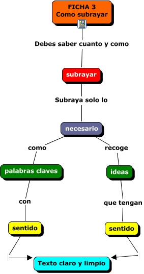 Este Cmap, tiene información relacionada con: FICHA 3, necesario recoge ideas, FICHA 3 Como subrayar Debes saber cuanto y como subrayar, subrayar Subraya solo lo necesario, necesario como palabras claves, sentido Texto claro y limpio, ideas que tengan sentido, palabras claves con sentido, sentido Texto claro y limpio
