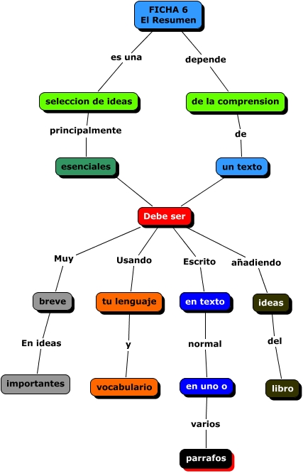 Este Cmap, tiene información relacionada con: FICHA 6, Debe ser Escrito en texto, tu lenguaje y vocabulario, un texto ???? Debe ser, Debe ser Muy breve, breve En ideas importantes, Debe ser añadiendo ideas, ideas del libro, FICHA 6 El Resumen depende de la comprension, de la comprension de un texto, en uno o varios parrafos, Debe ser Usando tu lenguaje, seleccion de ideas principalmente esenciales, en texto normal en uno o, esenciales ???? Debe ser, FICHA 6 El Resumen es una seleccion de ideas