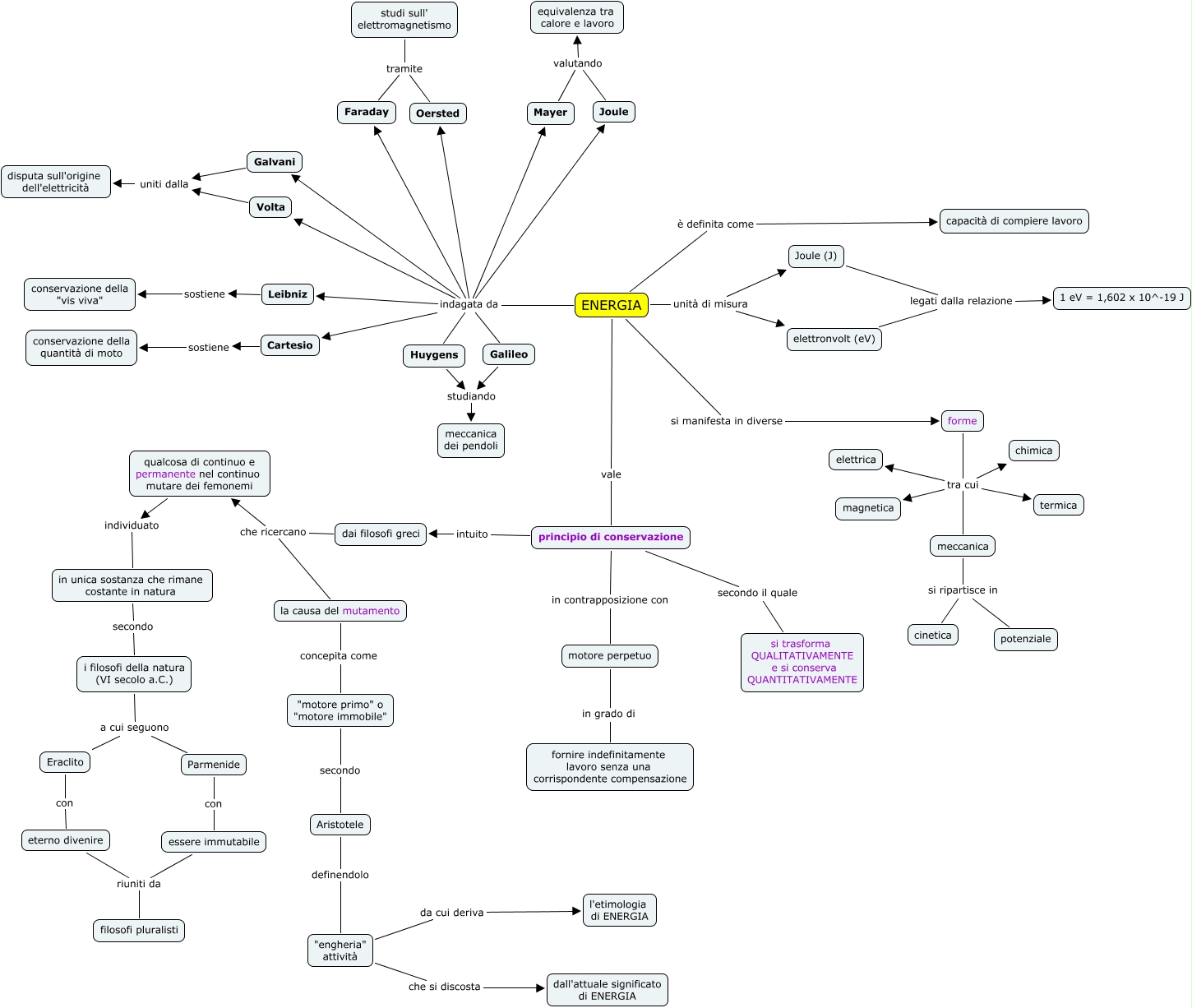 Questa Cmap, creata con IHMC CmapTools, contiene informazioni relative a: Energia, Aristotele definendolo "engheria" attività, la causa del mutamento concepita come "motore primo" o "motore immobile", ENERGIA indagata da Cartesio, Faraday tramite Oersted, Eraclito con eterno divenire, motore perpetuo in grado di fornire indefinitamente lavoro senza una corrispondente compensazione, ENERGIA indagata da Mayer, ENERGIA vale principio di conservazione, dai filosofi greci che ricercano qualcosa di continuo e permanente nel continuo mutare dei femonemi, ENERGIA unità di misura elettronvolt (eV), meccanica si ripartisce in potenziale, ENERGIA indagata da Faraday, ENERGIA indagata da Joule, Parmenide con essere immutabile, Huygens studiando meccanica dei pendoli, Galileo studiando meccanica dei pendoli, studi sull' elettromagnetismo tramite Oersted, forme tra cui chimica, "motore primo" o "motore immobile" secondo Aristotele, i filosofi della natura (VI secolo a.C.) a cui seguono Eraclito