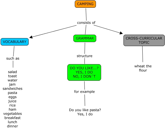 Este Cmap, tiene información relacionada con: CAMPING (Joaquín y Miguel F), GRAMMAR structure DO YOU LIKE...? YES, I DO NO, I DON´T, CAMPING consists of GRAMMAR, DO YOU LIKE...? YES, I DO NO, I DON´T for example Do you like pasta? Yes, I do, CROSS-CURRICULAR TOPIC ???? wheat the flour, VOCABULARY such as salad toast water jam sandwiches pasta eggs juice rice ham vegetables breakfast lunch dinner, CAMPING consists of VOCABULARY, CAMPING consists of CROSS-CURRICULAR TOPIC