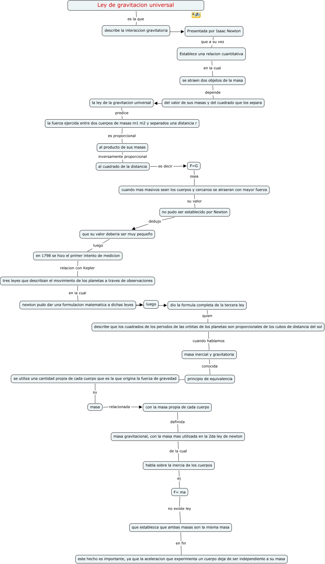 Este Cmap, tiene información relacionada con: ley de gravitacion universal luci perez, dio la formula completa de la tercera ley quien describe que los cuadrados de los periodos de las orbitas de los planetas son proporcionales de los cubos de distancia del sol, describe la interaccion gravitatoria ???? Presentada por Isaac Newton, F=G osea cuando mas masivos sean los cuerpos y cercanos se atraeran con mayor fuerza, masa relacionada con la masa propia de cada cuerpo, se atraen dos objetos de la masa depende del valor de sus masas y del cuadrado que los separa, Establece una relacion cuantitativa en la cual se atraen dos objetos de la masa, newton pudo dar una formulacion matematica a dichas leyes ???? dio la formula completa de la tercera ley, no pudo ser establecido por Newton dedujo que su valor deberia ser muy pequeño, newton pudo dar una formulacion matematica a dichas leyes ???? luego, se utiliza una cantidad propia de cada cuerpo que es la que origina la fuerza de gravedad su masa, la fuerza ejercida entre dos cuerpos de masas m1 m2 y separados una distancia r es proporcional al producto de sus masas, Presentada por Isaac Newton que a su vez Establece una relacion cuantitativa, describe que los cuadrados de los periodos de las orbitas de los planetas son proporcionales de los cubos de distancia del sol cuando hablamos masa inercial y gravitatoria, al producto de sus masas inversamente proporcional al cuadrado de la distancia, del valor de sus masas y del cuadrado que los separa ???? la ley de la gravitacion universal, masa inercial y gravitatoria conocida principio de equivalencia, F= ma no existe ley que establezca que ambas masas son la misma masa, en 1798 se hizo el primer intento de medicion relacion con Kepler tres leyes que describian el movimiento de los planetas a traves de observaciones, que su valor deberia ser muy pequeño luego en 1798 se hizo el primer intento de medicion, con la masa propia de cada cuerpo definida masa gravitacional, con la masa mas utilizada en la 2da ley de newton