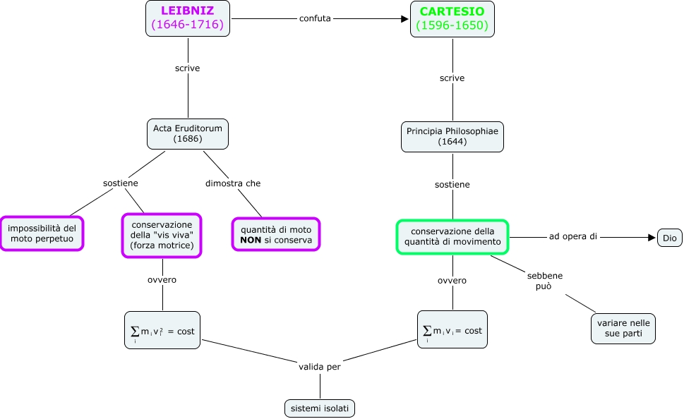 Questa Cmap, creata con IHMC CmapTools, contiene informazioni relative a: Cartesio-Leibniz, conservazione della quantità di movimento sebbene può variare nelle sue parti, LEIBNIZ (1646-1716) scrive Acta Eruditorum (1686), conservazione della quantità di movimento ovvero <math xmlns="http://www.w3.org/1998/Math/MathML"> <mrow> <munderover> <sum/> <mtext> i </mtext> <mtext> </mtext> </munderover> <mmultiscripts> <mtext> m </mtext> <mtext> i </mtext> <none/> </mmultiscripts> <mmultiscripts> <mtext> v </mtext> <mtext> i </mtext> <none/> </mmultiscripts> <mtext> = cost </mtext> </mrow> </math>, Principia Philosophiae (1644) sostiene conservazione della quantità di movimento, LEIBNIZ (1646-1716) confuta CARTESIO (1596-1650), Acta Eruditorum (1686) dimostra che quantità di moto NON si conserva, <math xmlns="http://www.w3.org/1998/Math/MathML"> <mrow> <munderover> <sum/> <mtext> i </mtext> <mtext> </mtext> </munderover> <mmultiscripts> <mtext> m </mtext> <mtext> i </mtext> <none/> </mmultiscripts> <mmultiscripts> <mtext> v </mtext> <mtext> i </mtext> <none/> </mmultiscripts> <mtext> = cost </mtext> </mrow> </math> valida per sistemi isolati, <math xmlns="http://www.w3.org/1998/Math/MathML"> <mrow> <munderover> <sum/> <mtext> i </mtext> <mtext> </mtext> </munderover> <mmultiscripts> <mtext> m </mtext> <mtext> i </mtext> <none/> </mmultiscripts> <mmultiscripts> <mtext> v </mtext> <mtext> i </mtext> <mtext> 2 </mtext> </mmultiscripts> <mtext> = cost </mtext> </mrow> </math> valida per sistemi isolati, Acta Eruditorum (1686) sostiene conservazione della "vis viva" (forza motrice), Acta Eruditorum (1686) sostiene impossibilità del moto perpetuo, conservazione della quantità di movimento ad opera di Dio, CARTESIO (1596-1650) scrive Principia Philosophiae (1644), conservazione della "vis viva" (forza motrice) ovvero <math xmlns="http://www.w3.org/1998/Math/MathML"> <mrow> <munderover> <sum/> <mtext> i </mtext> <mtext> </mtext> </munderover> <mmultiscripts> <mtext> m </mtext> <mtext> i </mtext> <none/> </mmultiscripts> <mmultiscripts> <mtext> v </mtext> <mtext> i </mtext> <mtext> 2 </mtext> </mmultiscripts> <mtext> = cost </mtext> </mrow> </math>