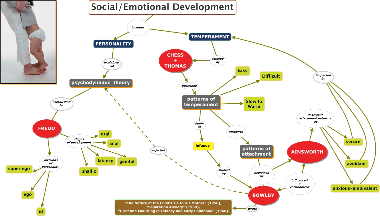 This Concept Map, created with IHMC CmapTools, has information related to: social_emotional, FREUD divisions of personality ego, FREUD stages of development genital, patterns of attachment explained by AINSWORTH, AINSWORTH described attachment patterns as anxious-ambivalent, BOWLBY rejected psychodynamic theory, anxious-ambivalent iimpacted by TEMPERAMENT, avoidant iimpacted by TEMPERAMENT, secure iimpacted by TEMPERAMENT, psychodynamic theory established by FREUD, TEMPERAMENT studied by CHESS + THOMAS, FREUD stages of development latency, patterns of temperament Slow to Warm, patterns of temperament Easy, patterns of temperament Difficult, Infancy studied by BOWLBY, PERSONALITY explained via psychodynamic theory, Social/Emotional Development includes PERSONALITY, FREUD stages of development phallic, FREUD stages of development oral, patterns of temperament influence patterns of attachment