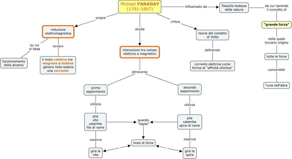 Questa Cmap, creata con IHMC CmapTools, contiene informazioni relative a: Faraday, pila calamita spira di rame osserva gira la spira, pila vite calamita filo di rame osserva gira la vite, Michael FARADAY (1791-1867) studia interazione tra campo elettrico e magnetico, Michael FARADAY (1791-1867) scopre induzione elettromagnetica, filosofia tedesca della natura da cui riprende il concetto di "grande forza", interazione tra campo elettrico e magnetico attraverso secondo esperimento, induzione elettromagnetica su cui si basa funzionamento della dinamo, Michael FARADAY (1791-1867) critica teoria del contatto di Volta, teoria del contatto di Volta definendo corrente elettrica come forma di "affinità chimica", primo esperimento utilizza pila vite calamita filo di rame, Michael FARADAY (1791-1867) influenzato da filosofia tedesca della natura, interazione tra campo elettrico e magnetico attraverso primo esperimento, induzione elettromagnetica ovvero il moto relativo tra magnete e bobina genera nella bobina una corrente, pila vite calamita filo di rame quando "taglia" linee di forza, "grande forza" nella quale trovano origine tutte le forze, tutte le forze convertibili l'una nell'altra, pila calamita spira di rame quando "taglia" linee di forza, secondo esperimento utilizza pila calamita spira di rame