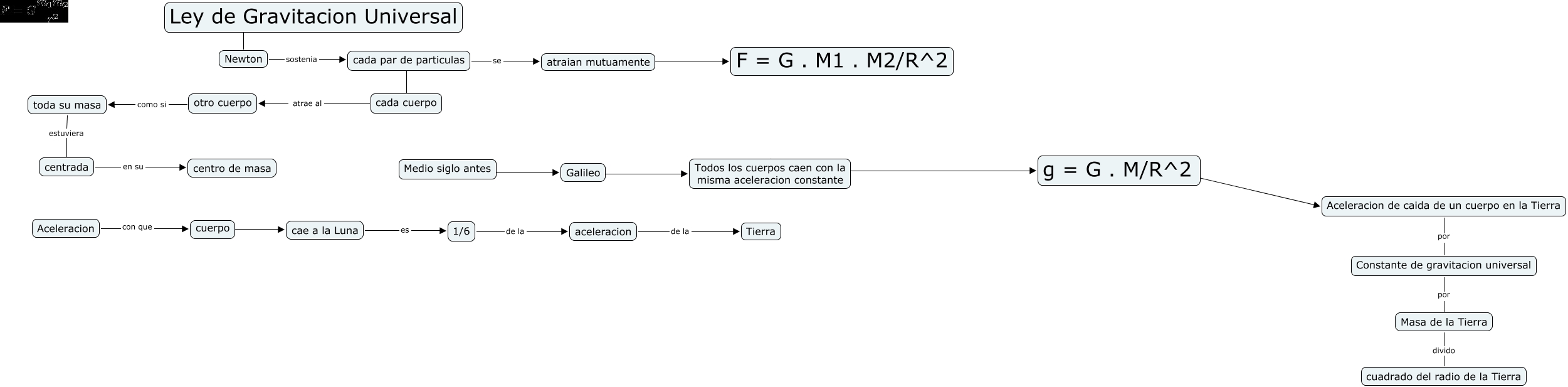 Este Cmap, tiene información relacionada con: Ley de Gravitacion Universal, aceleracion de la Tierra, atraian mutuamente ???? F = G . M1 . M2/R^2, Aceleracion con que cuerpo, cuerpo ???? cae a la Luna, Todos los cuerpos caen con la misma aceleracion constante ???? g = G . M/R^2, Constante de gravitacion universal por Masa de la Tierra, otro cuerpo como si toda su masa, g = G . M/R^2 ???? Aceleracion de caida de un cuerpo en la Tierra, cae a la Luna es 1/6, Masa de la Tierra divido cuadrado del radio de la Tierra, Aceleracion de caida de un cuerpo en la Tierra por Constante de gravitacion universal, cada par de particulas ???? cada cuerpo, Medio siglo antes ???? Galileo, Newton sostenia cada par de particulas, 1/6 de la aceleracion, toda su masa estuviera centrada, Ley de Gravitacion Universal ???? Newton, Galileo ???? Todos los cuerpos caen con la misma aceleracion constante, cada cuerpo atrae al otro cuerpo, cada par de particulas se atraian mutuamente