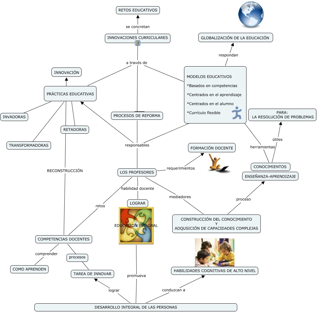 Este Cmap, tiene información relacionada con: Innovacion Educativa, PROCESOS DE REFORMA responsables PRÁCTICAS EDUCATIVAS, INNOVACIONES CURRICULARES se concretan RETOS EDUCATIVOS, COMPETENCIAS DOCENTES RECONSTRUCCIÓN INNOVACIÓN, CONOCIMIENTOS útiles PARA: LA RESOLUCIÓN DE PROBLEMAS, COMPETENCIAS DOCENTES TAREA DE INNOVAR, COMPETENCIAS DOCENTES comprender COMO APRENDEN, herramientas CONOCIMIENTOS, PROCESOS DE REFORMA responsables LOS PROFESORES, CONSTRUCCIÓN DEL CONOCIMIENTO Y ADQUSICIÓN DE CAPACIDADES COMPLEJAS proceso ENSEÑANZA-APRENDIZAJE, LOS PROFESORES requerimientos FORMACIÓN DOCENTE, LOS PROFESORES mediadores CONSTRUCCIÓN DEL CONOCIMIENTO Y ADQUSICIÓN DE CAPACIDADES COMPLEJAS, DESARROLLO INTEGRAL DE LAS PERSONAS lograr TAREA DE INNOVAR, INNOVACIONES CURRICULARES a través de MODELOS EDUCATIVOS *Basados en competencias *Centrados en el aprendizaje *Centrados en el alumno *Currículo flexible, PROCESOS DE REFORMA responsables ????, EDUCACION INTEGRAL promueva DESARROLLO INTEGRAL DE LAS PERSONAS, MODELOS EDUCATIVOS *Basados en competencias *Centrados en el aprendizaje *Centrados en el alumno *Currículo flexible respondan GLOBALIZACIÓN DE LA EDUCACIÓN, LOS PROFESORES habilidad docente LOGRAR, INNOVACIONES CURRICULARES a través de PRÁCTICAS EDUCATIVAS, PRÁCTICAS EDUCATIVAS ???? TRANSFORMADORAS, PRÁCTICAS EDUCATIVAS ???? INVADORAS