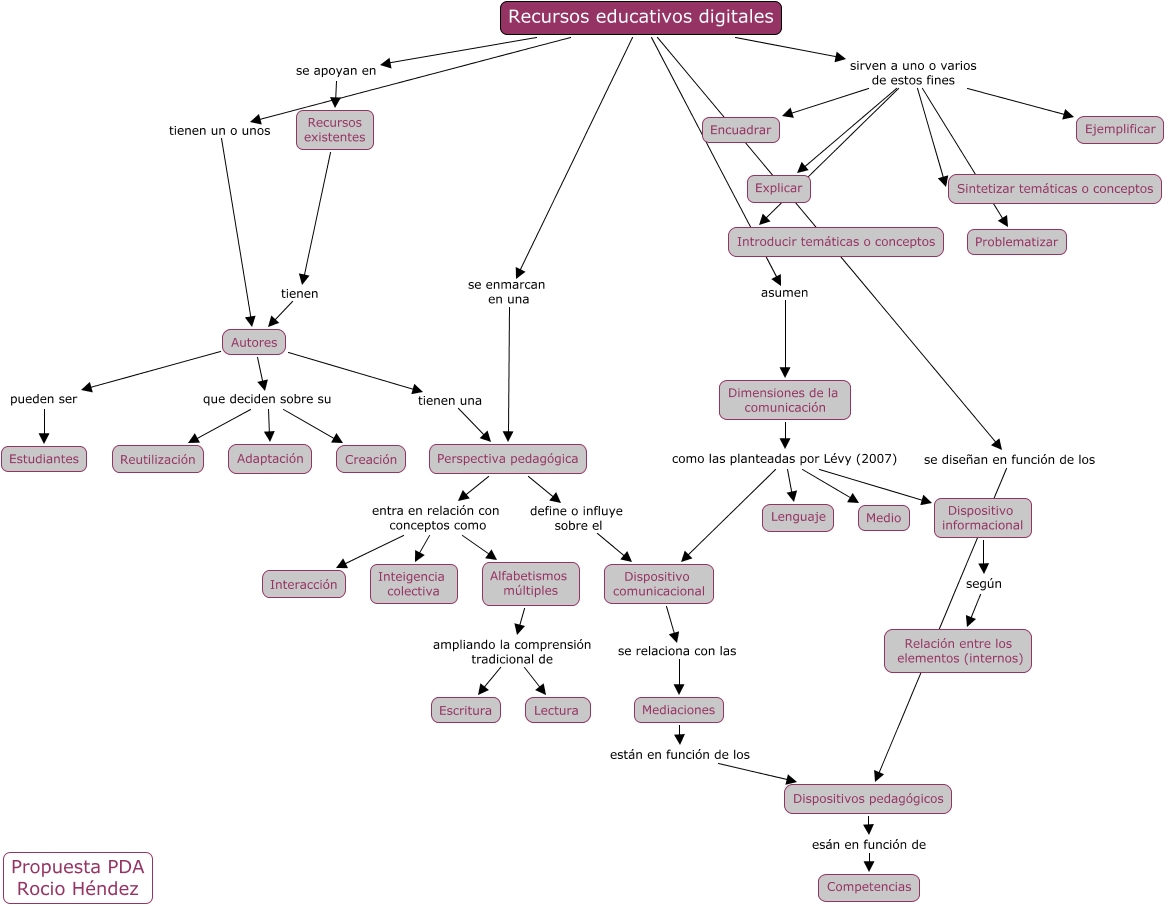 Este Cmap, tiene información relacionada con: Cuáles son los conceptos clave del curso de RE, Recursos existentes tienen Autores, Recursos educativos digitales se diseñan en función de los Dispositivos pedagógicos, Dispositivo comunicacional se relaciona con las Mediaciones, Autores que deciden sobre su Reutilización, Recursos educativos digitales sirven a uno o varios de estos fines Encuadrar, Perspectiva pedagógica entra en relación con conceptos como Interacción, Dispositivo informacional según Relación entre los elementos (internos), Recursos educativos digitales se enmarcan en una Perspectiva pedagógica, Dimensiones de la comunicación como las planteadas por Lévy (2007) Lenguaje, Recursos educativos digitales sirven a uno o varios de estos fines Explicar, Alfabetismos múltiples ampliando la comprensión tradicional de Escritura, Alfabetismos múltiples ampliando la comprensión tradicional de Lectura, Recursos educativos digitales asumen Dimensiones de la comunicación, Perspectiva pedagógica define o influye sobre el Dispositivo comunicacional, Recursos educativos digitales sirven a uno o varios de estos fines Introducir temáticas o conceptos, Perspectiva pedagógica entra en relación con conceptos como Alfabetismos múltiples, Recursos educativos digitales sirven a uno o varios de estos fines Problematizar, Autores que deciden sobre su Creación, Autores que deciden sobre su Adaptación, Dimensiones de la comunicación como las planteadas por Lévy (2007) Dispositivo comunicacional