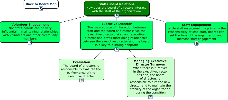 This Concept Map, created with IHMC CmapTools, has information related to: Staff-Board Relations, Staff/Board Relations How does the board of directors interact with the staff of the organization? ???? Volunteer Engagement Nonprofit boards can be very influential in maintaining relationships with volunteers and other community members., Staff/Board Relations How does the board of directors interact with the staff of the organization? ???? Staff Engagement While staff engagement is primarily the responsibility of lead staff, boards can set the tone of the organization and increase staff engagement, Executive Director The main source of interaction between staff and the board of director is via the executive director. A strong executive director and a well functioning relationship between the executive director and the board is a key to a strong nonprofit ???? Evaluation The board of directors is responsible to evaluate the perfromance of the executive director., Executive Director The main source of interaction between staff and the board of director is via the executive director. A strong executive director and a well functioning relationship between the executive director and the board is a key to a strong nonprofit ???? Managing Executive Director Turnover When there is turnover in the executivedirector position, the board of directors is responsible to hire the new director and to maintain the stability of the organization during the transition, Staff/Board Relations How does the board of directors interact with the staff of the organization? ???? Executive Director The main source of interaction between staff and the board of director is via the executive director. A strong executive director and a well functioning relationship between the executive director and the board is a key to a strong nonprofit