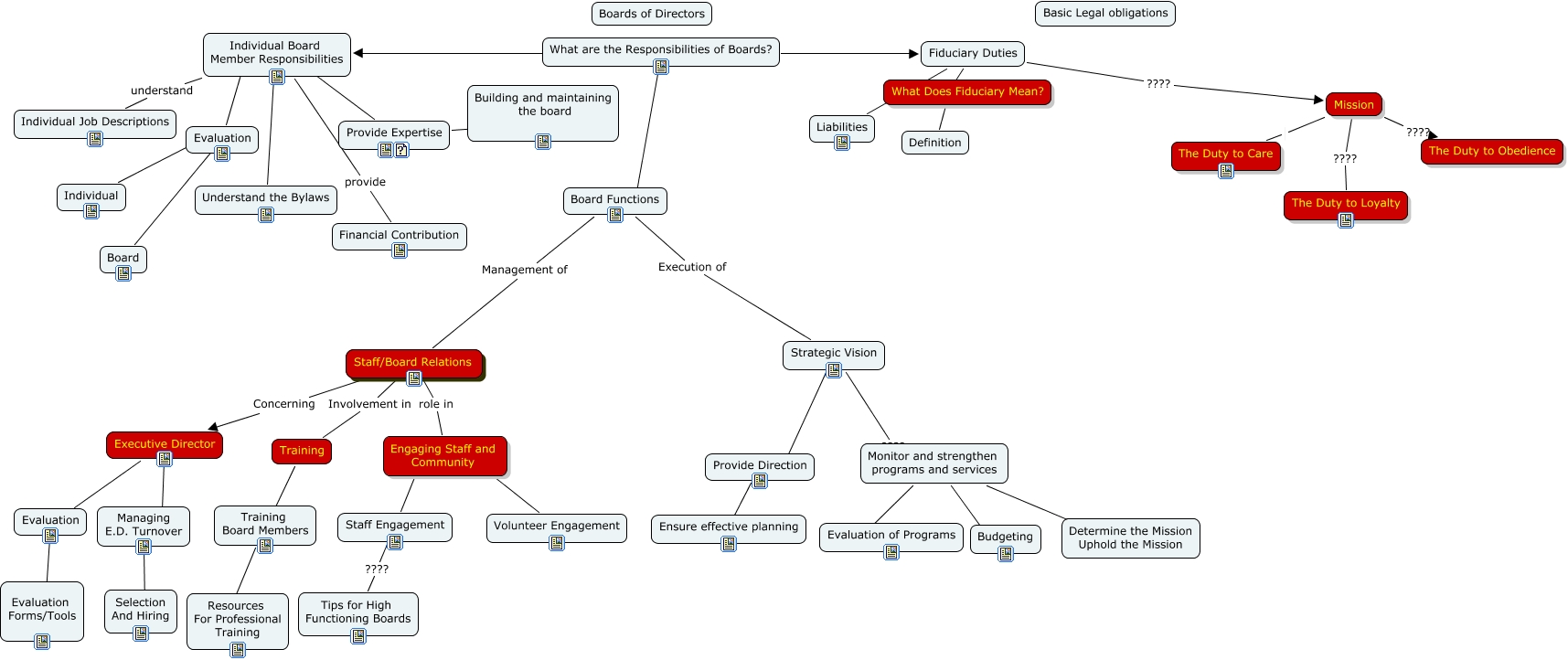 This Concept Map, created with IHMC CmapTools, has information related to: Boards of Directors, Managing E.D. Turnover ???? Selection And Hiring, What are the Responsibilities of Boards? ???? Board Functions, Individual Board Member Responsibilities ???? Understand the Bylaws, Fiduciary Duties Definition, What are the Responsibilities of Boards? ???? Individual Board Member Responsibilities, Evaluation ???? Evaluation Forms/Tools, Mission ???? The Duty to Obedience, Strategic Vision ???? Provide Direction, Monitor and strengthen programs and services ???? Evaluation of Programs, Provide Expertise ???? Building and maintaining the board, Mission The Duty to Care, Monitor and strengthen programs and services ???? Determine the Mission Uphold the Mission, Individual ???? Evaluation, Individual Board Member Responsibilities understand Individual Job Descriptions, Executive Director ???? Evaluation, Staff Engagement ???? Tips for High Functioning Boards, Staff/Board Relations Involvement in Training, Mission ???? The Duty to Loyalty, Individual Board Member Responsibilities provide Financial Contribution, Monitor and strengthen programs and services ???? Budgeting
