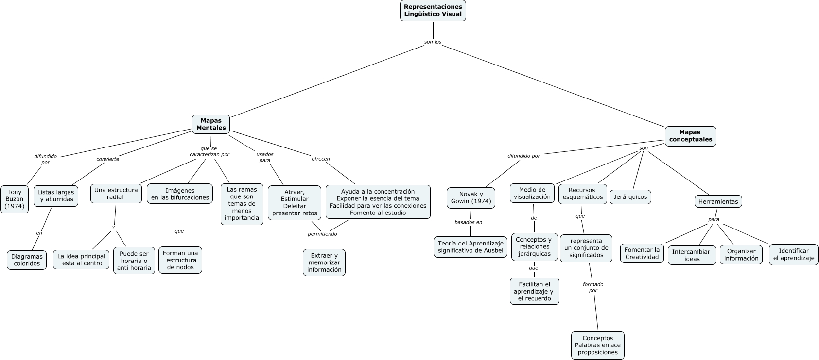 Este Cmap, tiene información relacionada con: conceptuales VS mentales, Mapas conceptuales son Herramientas, Herramientas para Identificar el aprendizaje, Listas largas y aburridas en Diagramas coloridos, Representaciones Lingüístico Visual son los Mapas conceptuales, Mapas Mentales que se caracterizan por Una estructura radial, Imágenes en las bifurcaciones que Forman una estructura de nodos, Recursos esquemáticos que representa un conjunto de significados, Mapas Mentales difundido por Tony Buzan (1974), Herramientas para Organizar información, representa un conjunto de significados formado por Conceptos Palabras enlace proposiciones, Una estructura radial y Puede ser horaria o anti horaria, Representaciones Lingüístico Visual son los Mapas Mentales, Mapas conceptuales son Jerárquicos, Conceptos y relaciones jerárquicas que Facilitan el aprendizaje y el recuerdo, Mapas conceptuales difundido por Novak y Gowin (1974), Atraer, Estimular Deleitar presentar retos permitiendo Extraer y memorizar información, Mapas conceptuales son Recursos esquemáticos, Herramientas para Intercambiar ideas, Medio de visualización de Conceptos y relaciones jerárquicas, Mapas conceptuales son Medio de visualización
