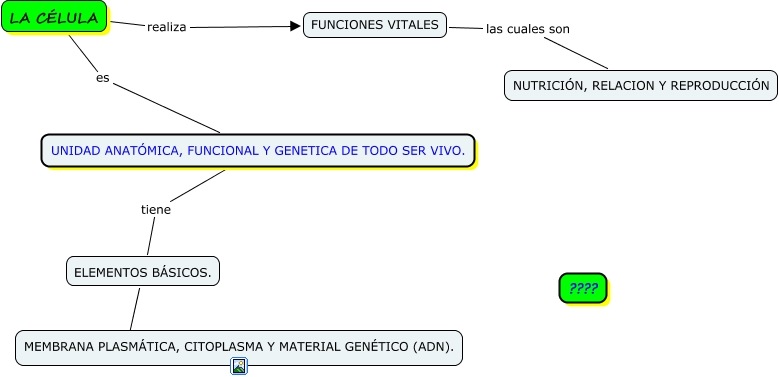 Este Cmap, tiene información relacionada con: LA CELULA, FUNCIONES VITALES las cuales son NUTRICIÓN, RELACION Y REPRODUCCIÓN, UNIDAD ANATÓMICA, FUNCIONAL Y GENETICA DE TODO SER VIVO. tiene ELEMENTOS BÁSICOS., ELEMENTOS BÁSICOS. son MEMBRANA PLASMÁTICA, CITOPLASMA Y MATERIAL GENÉTICO (ADN)., LA CÉLULA es UNIDAD ANATÓMICA, FUNCIONAL Y GENETICA DE TODO SER VIVO., LA CÉLULA realiza FUNCIONES VITALES