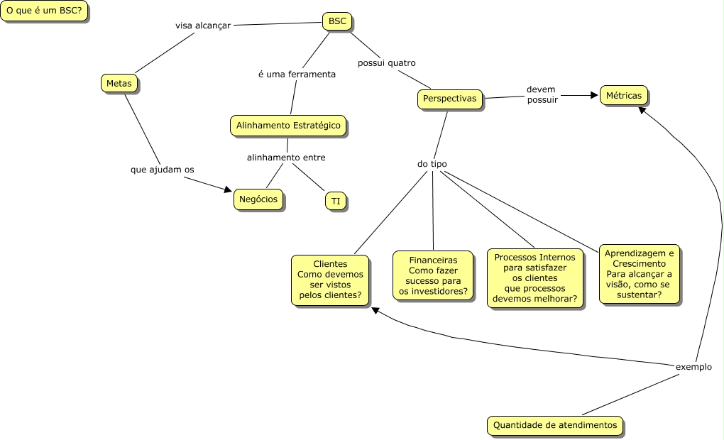 Esse mapa conceitual, produzido no IHMC CmapTools, tem a informação relacionada a: BSC, Alinhamento Estratégico alinhamento entre Negócios, Quantidade de atendimentos exemplo Clientes Como devemos ser vistos pelos clientes?, BSC visa alcançar Metas, BSC é uma ferramenta Alinhamento Estratégico, BSC possui quatro Perspectivas, Perspectivas do tipo Clientes Como devemos ser vistos pelos clientes?, Metas que ajudam os Negócios, TI alinhamento entre Negócios, Perspectivas devem possuir Métricas, Perspectivas do tipo Financeiras Como fazer sucesso para os investidores?, Perspectivas do tipo Aprendizagem e Crescimento Para alcançar a visão, como se sustentar?, Quantidade de atendimentos exemplo Métricas, Perspectivas do tipo Processos Internos para satisfazer os clientes que processos devemos melhorar?
