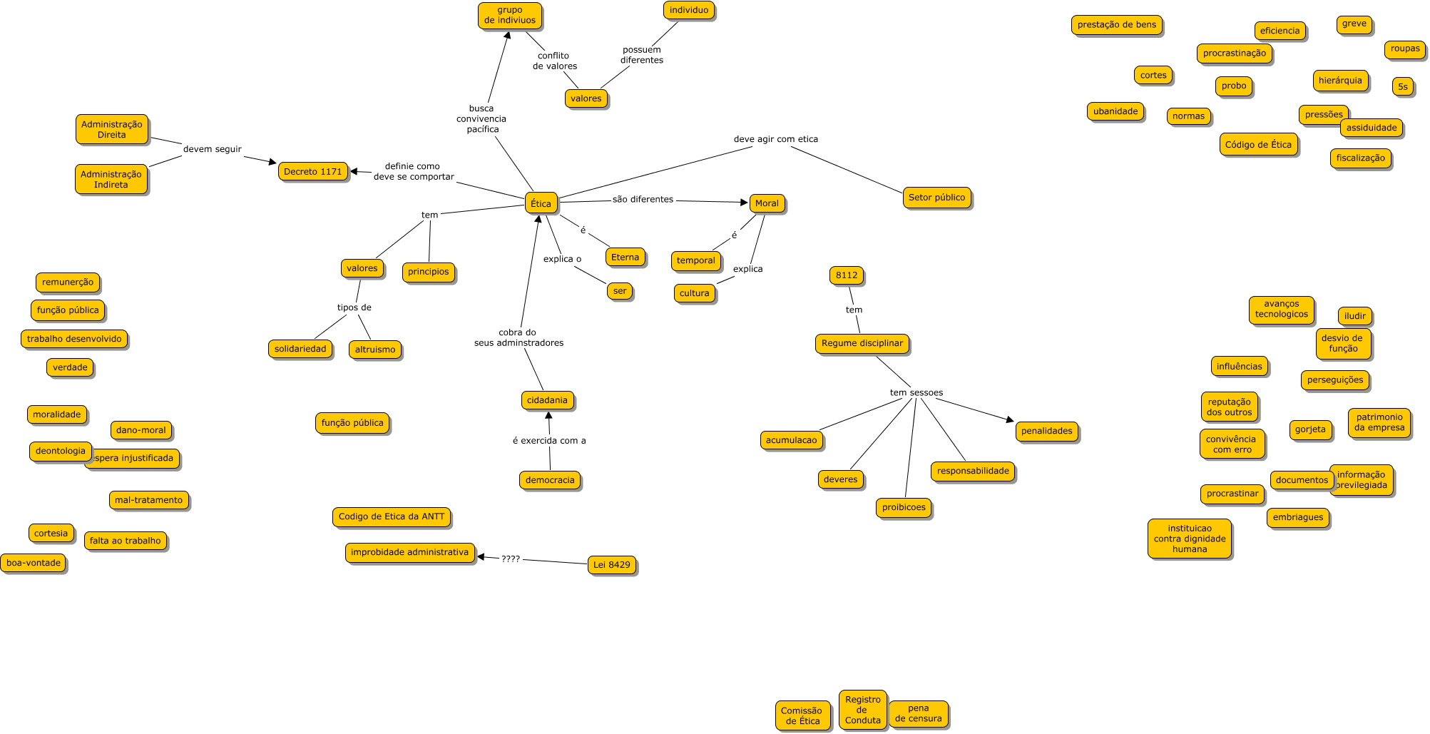 Esse mapa conceitual, produzido no IHMC CmapTools, tem a informação relacionada a: Ética no Serviço público, Regume disciplinar tem sessoes deveres, Ética são diferentes Moral, Regume disciplinar tem sessoes acumulacao, Ética definie como deve se comportar Decreto 1171, valores tipos de altruismo, Ética é Eterna, grupo de indiviuos conflito de valores valores, Ética tem valores, 8112 tem Regume disciplinar, Administração Indireta devem seguir Decreto 1171, cidadania cobra do seus adminstradores Ética, Administração Direita devem seguir Decreto 1171, individuo possuem diferentes valores, Lei 8429 ???? improbidade administrativa, Ética deve agir com etica Setor público, democracia é exercida com a cidadania, Regume disciplinar tem sessoes responsabilidade, Moral explica cultura, valores tipos de solidariedad, Moral é temporal