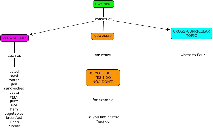 Este Cmap, tiene información relacionada con: CAMPING (Rodrigo,Miguel J y Bea ), CAMPING consits of VOCABULARY, CAMPING consits of CROSS-CURRICULAR TOPIC, GRAMMAR structure DO YOU LIKE...? YES,I DO NO,I DON'T, DO YOU LIKE...? YES,I DO NO,I DON'T for example Do you like pasta? Yes,i do, CAMPING consits of GRAMMAR, VOCABULARY such as salad toast water jam sandwiches pasta eggs juice rice ham vegetables breakfast lunch dinner, CROSS-CURRICULAR TOPIC ???? ????, CROSS-CURRICULAR TOPIC ???? wheat to flour