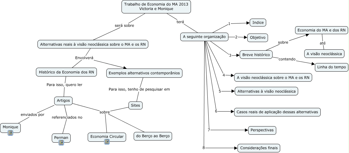 Esse mapa conceitual, produzido no IHMC CmapTools, tem a informação relacionada a: MapaCentral_TrabEconomiaMA, Trabalho de Economia do MA 2013 Victoria e Monique terá A seguinte organização, Breve histórico contendo Linha do tempo, Sites sobre Economia Circular, Histórico da Economia dos RN Para isso, quero ler Artigos, Artigos sobre Economia Circular, A seguinte organização 1 Indice, A seguinte organização 2 Objetivo, Alternativas reais à visão neoclássica sobre o MA e os RN Envolverá Histórico da Economia dos RN, Alternativas reais à visão neoclássica sobre o MA e os RN Envolverá Exemplos alternativos contemporânios, A seguinte organização 5 Alternativas à visão neoclássica, Sites sobre do Berço ao Berço, Artigos enviados por Monique, Artigos sobre do Berço ao Berço, A seguinte organização 7 Perspectivas, Artigos referenciados no Perman, Breve histórico sobre Economia do MA e dos RN, Trabalho de Economia do MA 2013 Victoria e Monique será sobre Alternativas reais à visão neoclássica sobre o MA e os RN, A seguinte organização 6 Casos reais de aplicação dessas alternativas, Exemplos alternativos contemporânios Para isso, tenho de pesquisar em Sites, A seguinte organização 3 Breve histórico