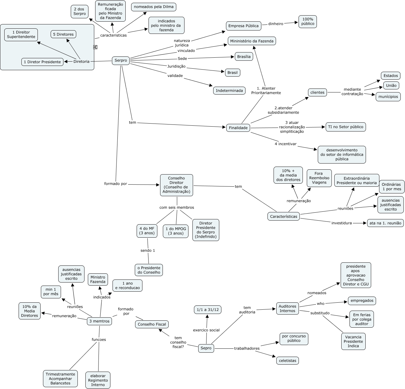 Esse mapa conceitual, produzido no IHMC CmapTools, tem a informação relacionada a: Serpro, Auditores Internos who empregados, Conselho Direitor (Conselho de Administração) com seis membros 1 do MPOG (3 anos), Auditores Internos substitudo Vacancia Presidente Indica, clientes mediante contratação União, ???? caracteristicas indicados pelo ministro da fazenda, Sepro trabalhadores por concurso público, Conselho Fiscal formado por 3 memtros, Características reuniões ausencias justificadas escrito, 3 memtros reuniões ausencias justificadas escrito, ???? caracteristicas 2 dos Serpro, 3 memtros funcoes elaborar Regimento Interno, Serpro Diretoria 1 Diretor Presidente, Serpro natureza jurídica Empresa Pública, 3 memtros indicados Ministro Fazenda, Características remuneração Fora Reembolso Viagens, Auditores Internos substitudo Em ferias por colega auditor, Serpro Diretoria 1 Direitor Superitendente, ???? caracteristicas nomeados pela Dilma, Finalidade 4 incentivar desenvolvimento do setor de informática pública, Finalidade 2.atender subsidiariamente clientes