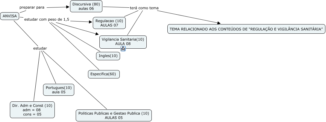 Esse mapa conceitual, produzido no IHMC CmapTools, tem a informação relacionada a: Anvisa_2013, ANVISA estudar com peso de 1,5 Regulacao (10) AULAS 07, Discursiva (80) aulas 06 terá como tema Regulacao (10) AULAS 07, ANVISA estudar com peso de 1,5 Vigilancia Sanitaria(10) AULA 08, Discursiva (80) aulas 06 terá como tema TEMA RELACIONADO AOS CONTEÚDOS DE “REGULAÇÃO E VIGILÂNCIA SANITÁRIA”, ANVISA estudar com peso de 1,5 Ingles(10), ANVISA estudar Portugues(10) aula 05, ANVISA estudar Politicas Publicas e Gestao Publica (10) AULAS 05, ANVISA estudar Dir. Adm e Const (10) adm = 08 cons = 05, Discursiva (80) aulas 06 terá como tema Vigilancia Sanitaria(10) AULA 08, ANVISA preparar para Discursiva (80) aulas 06, ANVISA estudar com peso de 1,5 Especifica(60)