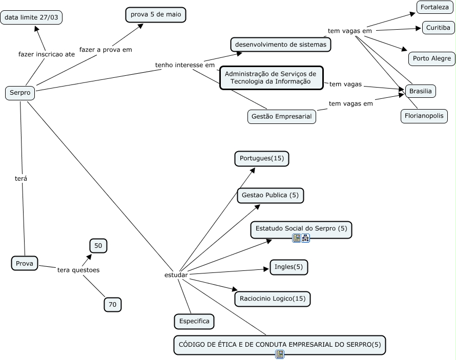 Esse mapa conceitual, produzido no IHMC CmapTools, tem a informação relacionada a: Serpro 2013, Serpro estudar Raciocinio Logico(15), Prova tera questoes 70, desenvolvimento de sistemas tem vagas em Fortaleza, Serpro estudar Especifica, Serpro fazer inscricao ate data limite 27/03, Serpro estudar Ingles(5), desenvolvimento de sistemas tem vagas em Florianopolis, Serpro estudar Estatudo Social do Serpro (5), Serpro estudar Gestao Publica (5), Serpro estudar CÓDIGO DE ÉTICA E DE CONDUTA EMPRESARIAL DO SERPRO(5), Prova tera questoes 50, Gestão Empresarial tem vagas em Brasilia, desenvolvimento de sistemas tem vagas em Curitiba, Serpro tenho interesse em desenvolvimento de sistemas, desenvolvimento de sistemas tem vagas em Brasilia, Serpro estudar Portugues(15), Serpro tenho interesse em Gestão Empresarial, Serpro fazer a prova em prova 5 de maio, Administração de Serviços de Tecnologia da Informação tem vagas Brasilia, Serpro tenho interesse em Administração de Serviços de Tecnologia da Informação