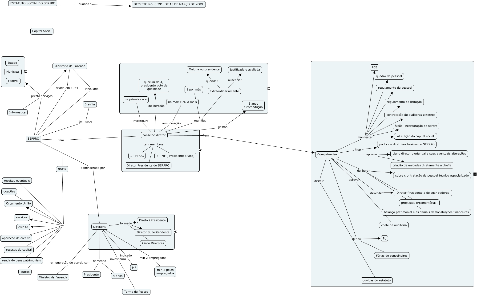 Esse mapa conceitual, produzido no IHMC CmapTools, tem a informação relacionada a: Estatuto do Serpro, conselho diretor investidura na primeira ata, Competencias aprovar criação de unidades diretamente a chefia, grana vem operacao de credito, Competencias definir Férias do conselheiros, receitas eventuais vem serviços, grana vem serviços, SERPRO tem sede Brasilia, conselho diretor tem Competencias, Competencias manifestar fusão, incorporação do serpro, receitas eventuais vem credito, conselho diretor gestão 3 anos c recondução, Competencias deliberar propostas orçamentárias;, grana vem credito, Competencias manifestar regulamento de pessoal, Direitoria formado Diretor Superitendente, Competencias manifestar contratação de auditores externos, Direitoria investidura Termo de Pessoa, doações vem serviços, Direitoria formado Diretori Presidente, Competencias deliberar sobre crontratação de pessoal técnico especializado