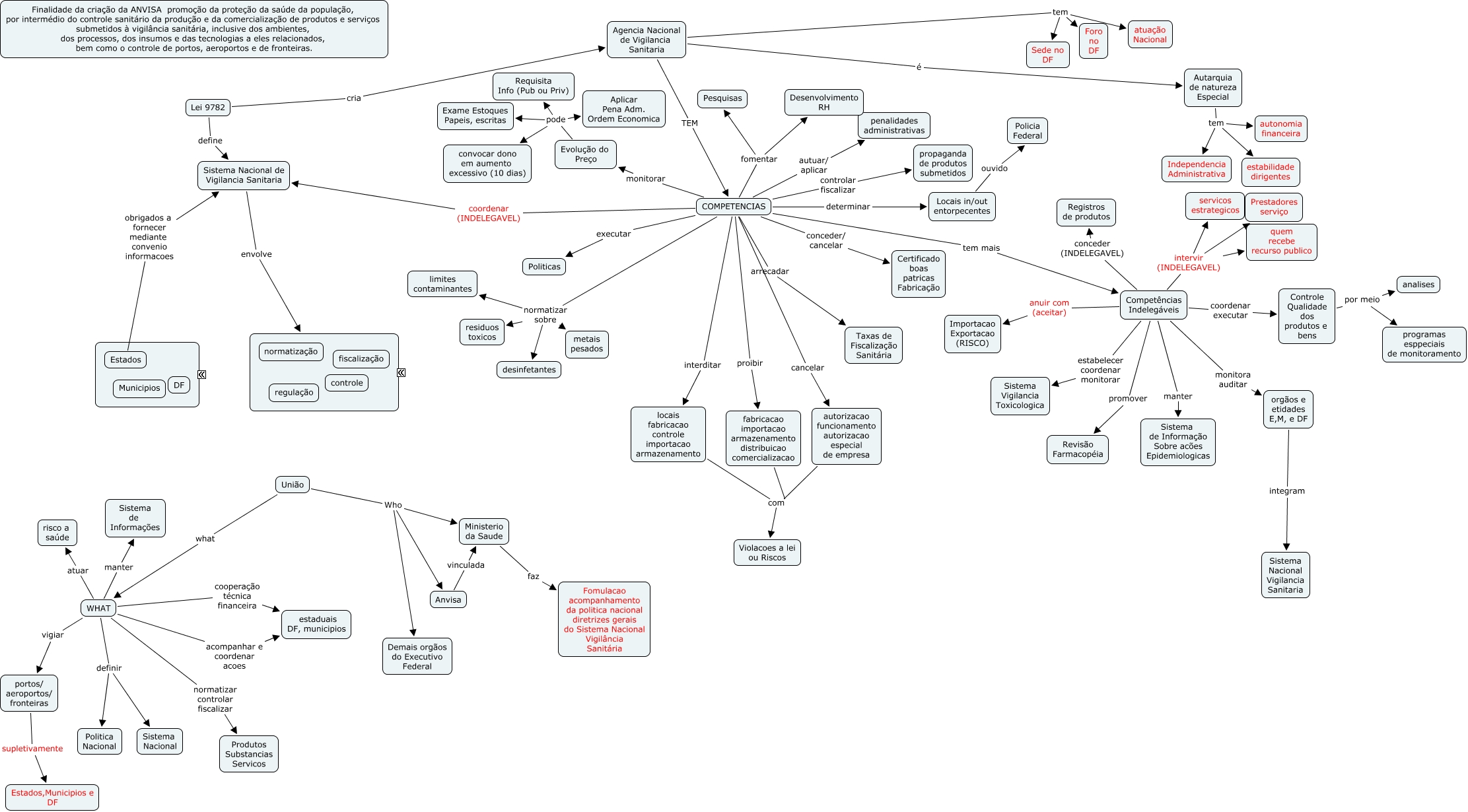 Esse mapa conceitual, produzido no IHMC CmapTools, tem a informação relacionada a: Introdução, Competências Indelegáveis manter Sistema de Informação Sobre acões Epidemiologicas, COMPETENCIAS executar Politicas, WHAT atuar risco a saúde, COMPETENCIAS normatizar sobre metais pesados, Agencia Nacional de Vigilancia Sanitaria é Autarquia de natureza Especial, Competências Indelegáveis promover Revisão Farmacopéia, União Who Ministerio da Saude, COMPETENCIAS fomentar Pesquisas, Agencia Nacional de Vigilancia Sanitaria TEM COMPETENCIAS, Controle Qualidade dos produtos e bens por meio programas esppeciais de monitoramento, COMPETENCIAS tem mais Competências Indelegáveis, Competências Indelegáveis intervir (INDELEGAVEL) servicos estrategicos, Anvisa vinculada Ministerio da Saude, Evolução do Preço pode Aplicar Pena Adm. Ordem Economica, COMPETENCIAS normatizar sobre residuos toxicos, WHAT acompanhar e coordenar acoes estaduais DF, municipios, COMPETENCIAS coordenar (INDELEGAVEL) Sistema Nacional de Vigilancia Sanitaria, Competências Indelegáveis estabelecer coordenar monitorar Sistema Vigilancia Toxicologica, orgãos e etidades E,M, e DF integram Sistema Nacional Vigilancia Sanitaria, União Who Demais orgãos do Executivo Federal