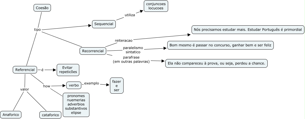 Esse mapa conceitual, produzido no IHMC CmapTools, tem a informação relacionada a: Coesao e Coerencia, Sequencial utiliza conjuncoes locucoes, Referencial how verbo, Coesão tipo Recorrencial, Recorrencial reiteracao Nós precisamos estudar mais. Estudar Português é primordial, Coesão tipo Referencial, Coesão tipo Sequencial, Referencial é Evitar repeticões, Recorrencial parafrase (em outras palavras) Ela não compareceu à prova, ou seja, perdeu a chance., Recorrencial paralelismo sintatico Bom mesmo é passar no concurso, ganhar bem e ser feliz, Referencial how pronomes nuemerias adverbios substantivos elipse, verbo exemplo fazer e ser, Referencial valor Anaforico, Referencial valor cataforico