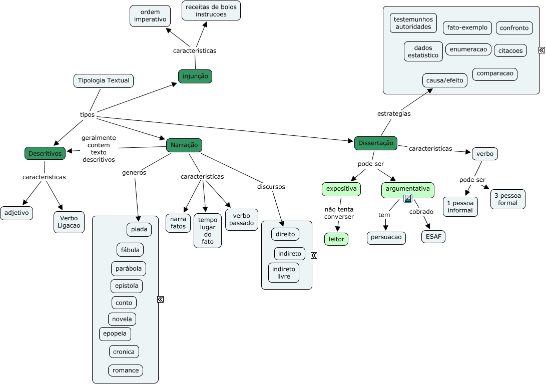 Esse mapa conceitual, produzido no IHMC CmapTools, tem a informação relacionada a: Tipologia Textual, Dissertação pode ser expositiva, injunção caracteristicas receitas de bolos instrucoes, Narração generos piada, Tipologia Textual tipos Descritivos, Descritivos caracteristicas Verbo Ligacao, verbo pode ser 3 pessoa formal, Tipologia Textual tipos injunção, expositiva não tenta converser leitor, Narração caracteristicas narra fatos, injunção caracteristicas ordem imperativo, verbo pode ser 1 pessoa informal, argumentativa tem persuacao, Dissertação pode ser argumentativa, Narração caracteristicas verbo passado, Dissertação estrategias causa/efeito, Tipologia Textual tipos Narração, Narração caracteristicas tempo lugar do fato, Tipologia Textual tipos Dissertação, argumentativa cobrado ESAF, Dissertação caracteristicas verbo
