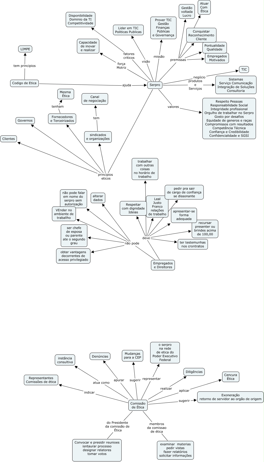 Esse mapa conceitual, produzido no IHMC CmapTools, tem a informação relacionada a: Codigo de Etica, Empregados e Direitores deve pedir pra sair de cargo de confiança se dissonante, Comissão de Ética representar o serpro na rede de etica do Poder Executivo Federal, Codigo de Etica tem principios LIMPE, Comissão de Ética membros da comissao de ética examinar materias pedir vistas fazer relatórios solicitar informações, Comissão de Ética sugerir Exoneração retorno de servidor ao orgão de origem, Comissão de Ética do Presidente da comissão de Ética Convocar e presidir reunioes isntaurar processo designar relatores tomar votos, Serpro força Motriz Capacidade de inovar e realizar, Empregados e Direitores não pode alterar dados, Serpro produtos e Serviços Sistemas Serviço Comunicação Integração de Soluções Consultoria, Empregados e Direitores deve trabalhar com outras coisas no horário de trabalho, Comissão de Ética apurar Denúncias, Serpro principios eticos Governos, Serpro premissas Conquistar Reconhecimento Cliente, Serpro visão Lider em TIC Politicas Publicas, Serpro missão Prover TIC Gestão Finanças Públicas e Governança, Serpro negócio TIC, Empregados e Direitores deve recursar presenter ou brindes acima de 100,00, Empregados e Direitores deve apresentar-se forma adequada, Empregados e Direitores deve ter testemunhas nos crontratos, Serpro valores Respeito Pessoas Responsabilidade Social Integridade profissional Orgulho de trabalhar no Serpro Gosto por desafios Equidade de generos e raças Compromissos com resultados Competência Técnica Confiança e Credibilidade Confidencialidade e SGSI
