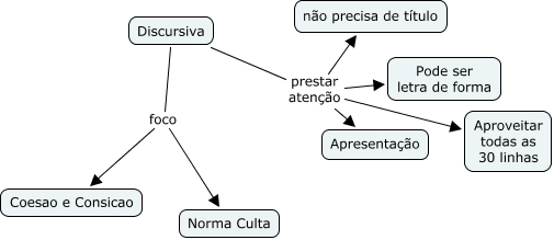 Esse mapa conceitual, produzido no IHMC CmapTools, tem a informação relacionada a: Discursiva, Discursiva foco Norma Culta, Discursiva prestar atenção Apresentação, Discursiva prestar atenção Aproveitar todas as 30 linhas, Discursiva foco Coesao e Consicao, Discursiva prestar atenção não precisa de título, Discursiva prestar atenção Pode ser letra de forma