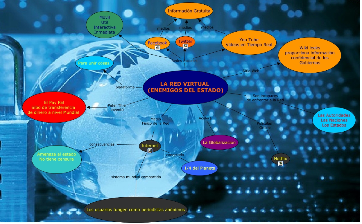 Este Cmap, tiene información relacionada con: La red Virtual, Internet sistema mundial compartido Los usuarios fungen como periodístas anónimos, LA RED VIRTUAL (ENEMIGOS DEL ESTADO) plataforma Para unir cosas., LA RED VIRTUAL (ENEMIGOS DEL ESTADO) Redes Sociales Movil Util Interactiva Inmediata, LA RED VIRTUAL (ENEMIGOS DEL ESTADO) Medio Fisico de la Red Internet, LA RED VIRTUAL (ENEMIGOS DEL ESTADO) Peter Thiel inventó El Pay Pal Sitio de transferencia de dinero a nivel Mundial, Twitter medios Información Gratuita, Facebook medios Información Gratuita, LA RED VIRTUAL (ENEMIGOS DEL ESTADO) Redes Sociales Twitter, You Tube Videos en Tiempo Real medios Información Gratuita, LA RED VIRTUAL (ENEMIGOS DEL ESTADO) Sitio Web Wiki leaks proporciona información confidencial de los Gobiernos, Internet conectado 1/4 del Planeta, Internet consecuencias Amenaza al estado No tiene censura, LA RED VIRTUAL (ENEMIGOS DEL ESTADO) Redes Sociales You Tube Videos en Tiempo Real, LA RED VIRTUAL (ENEMIGOS DEL ESTADO) Acelera La Globalización, LA RED VIRTUAL (ENEMIGOS DEL ESTADO) Películas Onlíne Netflix, LA RED VIRTUAL (ENEMIGOS DEL ESTADO) Son incapaces de enfrentar a la Red Las Autoridades Las Naciones Los Estados, LA RED VIRTUAL (ENEMIGOS DEL ESTADO) Redes Sociales Facebook