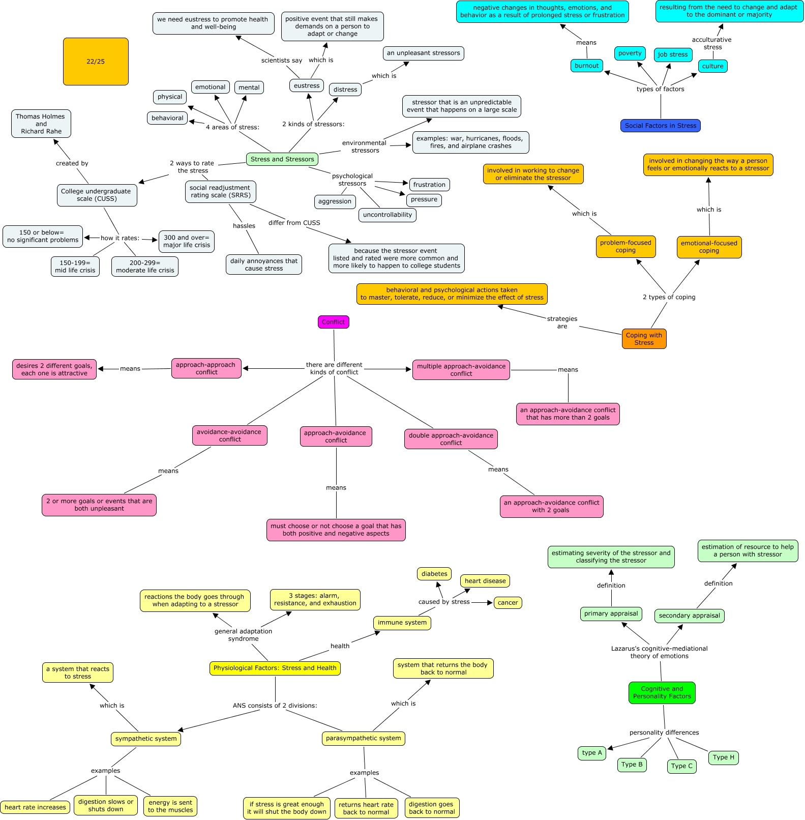 This Concept Map, created with IHMC CmapTools, has information related to: brooke chandler ch11 22, Coping with Stress 2 types of coping emotional-focused coping, College undergraduate scale (CUSS) how it rates: 300 and over= major life crisis, Cognitive and Personality Factors Lazarus's cognitive-mediational theory of emotions secondary appraisal, primary appraisal definition estimating severity of the stressor and classifying the stressor, Stress and Stressors psychological stressors frustration, sympathetic system examples energy is sent to the muscles, Stress and Stressors 2 kinds of stressors: distress, Physiological Factors: Stress and Health health immune system, sympathetic system examples digestion slows or shuts down, College undergraduate scale (CUSS) how it rates: 200-299= moderate life crisis, emotional-focused coping which is involved in changing the way a person feels or emotionally reacts to a stressor, Stress and Stressors psychological stressors uncontrollability, Physiological Factors: Stress and Health general adaptation syndrome 3 stages: alarm, resistance, and exhaustion, Cognitive and Personality Factors personality differences type A, Physiological Factors: Stress and Health general adaptation syndrome reactions the body goes through when adapting to a stressor, approach-avoidance conflict means must choose or not choose a goal that has both positive and negative aspects, Conflict there are different kinds of conflict avoidance-avoidance conflict, social readjustment rating scale (SRRS) hassles daily annoyances that cause stress, burnout means negative changes in thoughts, emotions, and behavior as a result of prolonged stress or frustration, College undergraduate scale (CUSS) created by Thomas Holmes and Richard Rahe