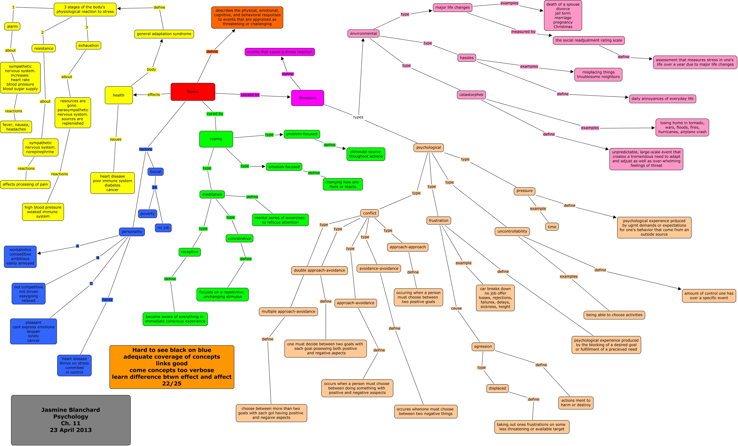 This Concept Map, created with IHMC CmapTools, has information related to: JBlanchard Ch 11 22, psychological type uncontrollability, uncontrollability define amount of control one has over a specific event, conflict type approach-avoidance, meditation type concetrative, catastorphes examples losing home in tornado, wars, floods, fires, hurricanes, airplane crash, environmental type hassles, pressure define psychological experience prduced by ugrnt demands or expectations for one's behavior that come from an outside source, 3 stages of the body's physiological reaction to stress 2 resistance, catastorphes define unpredictable, large-scale event that creates a tremendous need to adapt and adjust as well as over-whelming feelings of threat, coping type emotion-focused, frustration example car breaks down no job offer losses, rejections, failures, delays, sickness, height, environmental type major life changes, exhaustion about resources are gone. parasympathetic nervous system. sources are replenished, coping type problem-focused, conflict type double approach-avoidance, alarm about sympathetic nervous system. increases: heart rate blood pressure blood sugar supply, resources are gone. parasympathetic nervous system. sources are replenished reactions high blood pressure weaked immune system, meditation define mental series of excercises to refocus attention, uncontrollability examples being able to choose activities, environmental type catastorphes