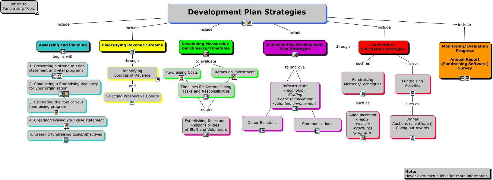 This Concept Map, created with IHMC CmapTools, has information related to: Development Plan (new color scheme), Implementing Development Plan Strategies to improve Donor Relations, Implementing Development Plan Strategies through Cultivation/ Solicitation Strategies, Return on Investment require Establishing Roles and Responsibilities of Staff and Volunteers, Fundraising Activities such as Dinner Auctions (silent/open) Giving out Awards, Implementing Development Plan Strategies to improve Infrastructure -Technology -Staffing -Board Involvement -Volunteer Involvement, Implementing Development Plan Strategies to improve Communications, Cultivation/ Solicitation Strategies such as Fundraising Methods/Techniques, Development Plan Strategies include Diversifying Revenue Streams, Fundraising Methods/Techniques such as Announcement -media -website -brochures -programs, Developing Measurable Benchmarks/Timetable to evaluate Fundraising Costs, Cultivation/ Solicitation Strategies such as Fundraising Activities, Diversifying Revenue Streams through Identifying Sources of Revenue, Identifying Sources of Revenue and Selecting Prospective Donors, Assessing and Planning begins with 5. Creating fundraising goals/objectives, Development Plan Strategies include Monitoring/Evaluating Progress Annual Report (Fundraising Software) Survey, Development Plan Strategies include Assessing and Planning, Development Plan Strategies include Implementing Development Plan Strategies, Developing Measurable Benchmarks/Timetable to evaluate Timelines for Accomplishing Tasks and Responsibilities, Development Plan Strategies include Cultivation/ Solicitation Strategies, Developing Measurable Benchmarks/Timetable to evaluate Return on Investment