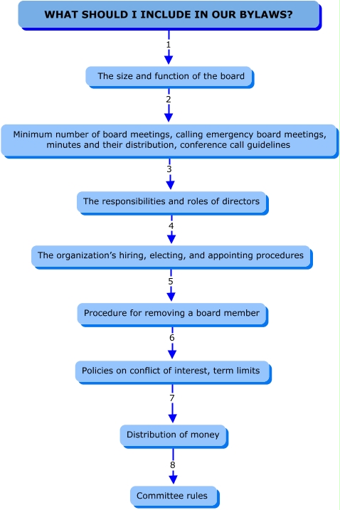 This Concept Map, created with IHMC CmapTools, has information related to: Bylaws Map - Final, Minimum number of board meetings, calling emergency board meetings, minutes and their distribution, conference call guidelines 3 The responsibilities and roles of directors, The size and function of the board 2 Minimum number of board meetings, calling emergency board meetings, minutes and their distribution, conference call guidelines, Policies on conflict of interest, term limits 7 Distribution of money, The organization’s hiring, electing, and appointing procedures 5 Procedure for removing a board member, Procedure for removing a board member 6 Policies on conflict of interest, term limits, Distribution of money 8 Committee rules, WHAT SHOULD I INCLUDE IN OUR BYLAWS? 1 The size and function of the board, The responsibilities and roles of directors 4 The organization’s hiring, electing, and appointing procedures