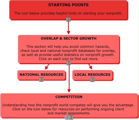 This Concept Map, created with IHMC CmapTools, has information related to: Needs Assessment, STARTING POINTS The icon below provides helpful hints on starting your nonprofit. ???? OVERLAP & SECTOR GROWTH This section will help you avoid common hazards, check local and national nonprofit databases for overlap, as well as provide useful statistics on nonprofit growth. Click on each icon to find out more., OVERLAP & SECTOR GROWTH This section will help you avoid common hazards, check local and national nonprofit databases for overlap, as well as provide useful statistics on nonprofit growth. Click on each icon to find out more. ???? NATIONAL RESOURCES, OVERLAP & SECTOR GROWTH This section will help you avoid common hazards, check local and national nonprofit databases for overlap, as well as provide useful statistics on nonprofit growth. Click on each icon to find out more. ???? LOCAL RESOURCES, OVERLAP & SECTOR GROWTH This section will help you avoid common hazards, check local and national nonprofit databases for overlap, as well as provide useful statistics on nonprofit growth. Click on each icon to find out more. ???? COMPETITION Understanding how the nonprofit world competes will give you the advantage. Click on the icon below for resources on performing ongoing client and market assessments.