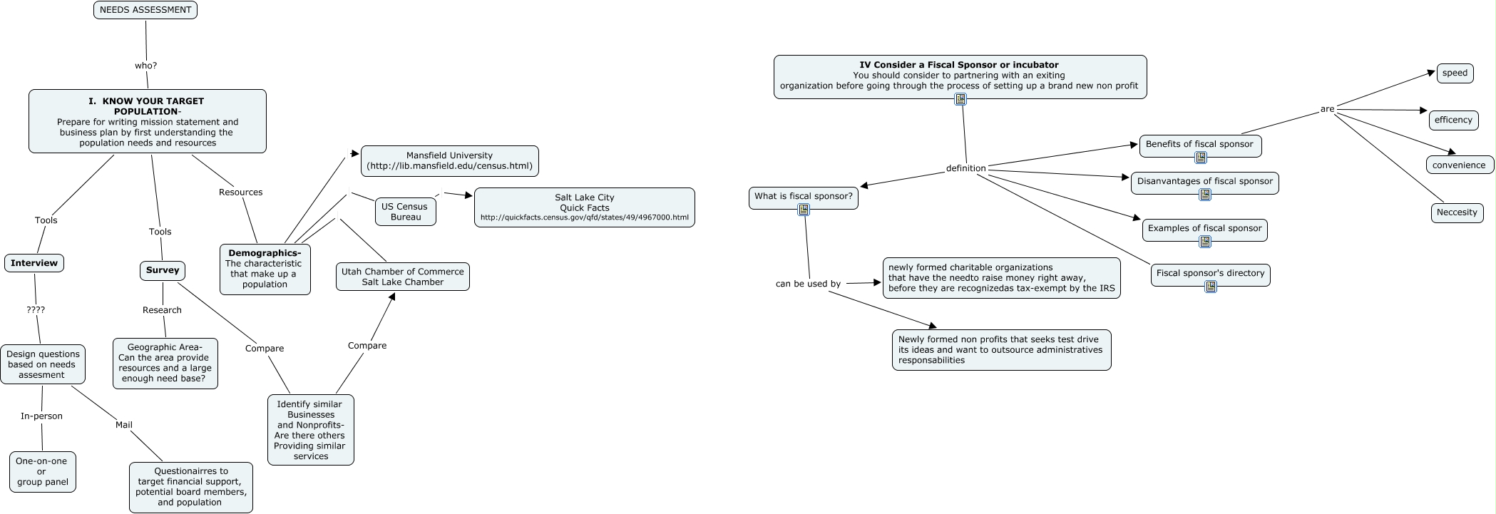 This Concept Map, created with IHMC CmapTools, has information related to: demographics, Benefits of fiscal sponsor are speed, I. KNOW YOUR TARGET POPULATION- Prepare for writing mission statement and business plan by first understanding the population needs and resources Tools Interview, What is fiscal sponsor? can be used by Newly formed non profits that seeks test drive its ideas and want to outsource administratives responsabilities, Survey Compare Identify similar Businesses and Nonprofits- Are there others Providing similar services, Survey Research Geographic Area- Can the area provide resources and a large enough need base?, IV Consider a Fiscal Sponsor or incubator You should consider to partnering with an exiting organization before going through the process of setting up a brand new non profit definition Fiscal sponsor's directory, I. KNOW YOUR TARGET POPULATION- Prepare for writing mission statement and business plan by first understanding the population needs and resources Resources Demographics- The characteristic that make up a population, What is fiscal sponsor? can be used by newly formed charitable organizations that have the needto raise money right away, before they are recognizedas tax-exempt by the IRS, Demographics- The characteristic that make up a population Utah Chamber of Commerce Salt Lake Chamber, US Census Bureau Salt Lake City Quick Facts http://quickfacts.census.gov/qfd/states/49/4967000.html, NEEDS ASSESSMENT who? I. KNOW YOUR TARGET POPULATION- Prepare for writing mission statement and business plan by first understanding the population needs and resources, IV Consider a Fiscal Sponsor or incubator You should consider to partnering with an exiting organization before going through the process of setting up a brand new non profit definition Disanvantages of fiscal sponsor, Benefits of fiscal sponsor are efficency, Benefits of fiscal sponsor are convenience, IV Consider a Fiscal Sponsor or incubator You should consider to partnering with an exiting organization before going through the process of setting up a brand new non profit definition Benefits of fiscal sponsor, Design questions based on needs assesment In-person One-on-one or group panel, I. KNOW YOUR TARGET POPULATION- Prepare for writing mission statement and business plan by first understanding the population needs and resources Tools Survey, Demographics- The characteristic that make up a population Mansfield University (http://lib.mansfield.edu/census.html), Interview ???? Design questions based on needs assesment, IV Consider a Fiscal Sponsor or incubator You should consider to partnering with an exiting organization before going through the process of setting up a brand new non profit definition Examples of fiscal sponsor