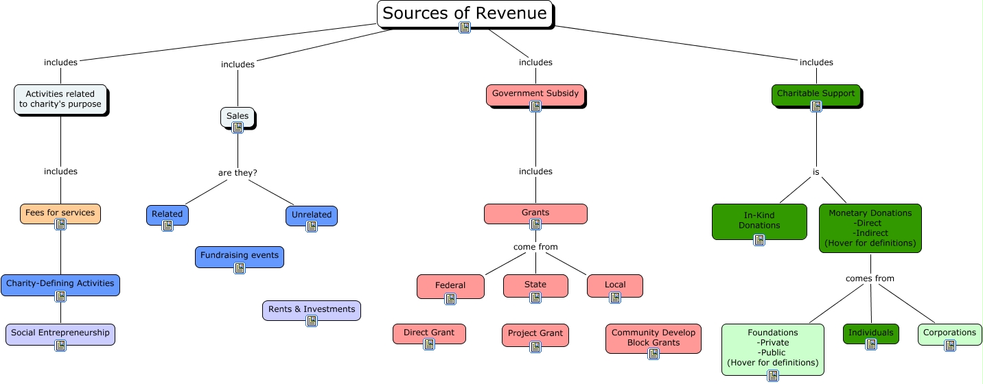 This Concept Map, created with IHMC CmapTools, has information related to: Sources of Revenue Minor VERTICAL VERSION!, Sources of Revenue includes Activities related to charity's purpose, Sources of Revenue includes Charitable Support, Grants come from Federal, Sources of Revenue includes Government Subsidy, Charitable Support is Monetary Donations -Direct -Indirect (Hover for definitions), Sales are they? Unrelated, Monetary Donations -Direct -Indirect (Hover for definitions) comes from Individuals, Sales are they? Related, Monetary Donations -Direct -Indirect (Hover for definitions) comes from Foundations -Private -Public (Hover for definitions), Activities related to charity's purpose includes Fees for services, Monetary Donations -Direct -Indirect (Hover for definitions) comes from Corporations, Activities related to charity's purpose includes Social Entrepreneurship, Government Subsidy includes Grants, Grants come from Local, Activities related to charity's purpose includes Charity-Defining Activities, Grants come from State, Charitable Support is In-Kind Donations, Sources of Revenue includes Sales