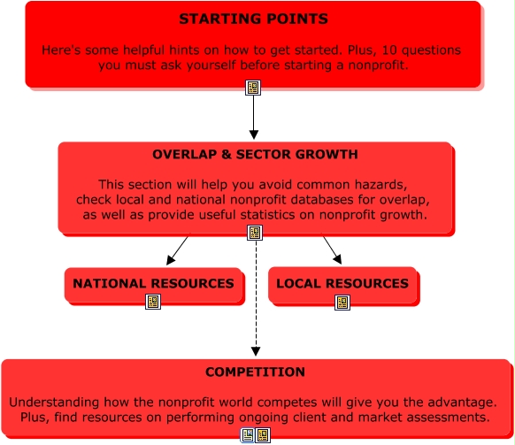 This Concept Map, created with IHMC CmapTools, has information related to: NA Submap Step 1 (Redundancy) - Final, OVERLAP & SECTOR GROWTH This section will help you avoid common hazards, check local and national nonprofit databases for overlap, as well as provide useful statistics on nonprofit growth. ???? LOCAL RESOURCES, OVERLAP & SECTOR GROWTH This section will help you avoid common hazards, check local and national nonprofit databases for overlap, as well as provide useful statistics on nonprofit growth. ???? NATIONAL RESOURCES, STARTING POINTS Here's some helpful hints on how to get started. Plus, 10 questions you must ask yourself before starting a nonprofit. ???? OVERLAP & SECTOR GROWTH This section will help you avoid common hazards, check local and national nonprofit databases for overlap, as well as provide useful statistics on nonprofit growth., OVERLAP & SECTOR GROWTH This section will help you avoid common hazards, check local and national nonprofit databases for overlap, as well as provide useful statistics on nonprofit growth. ???? COMPETITION Understanding how the nonprofit world competes will give you the advantage. Plus, find resources on performing ongoing client and market assessments.