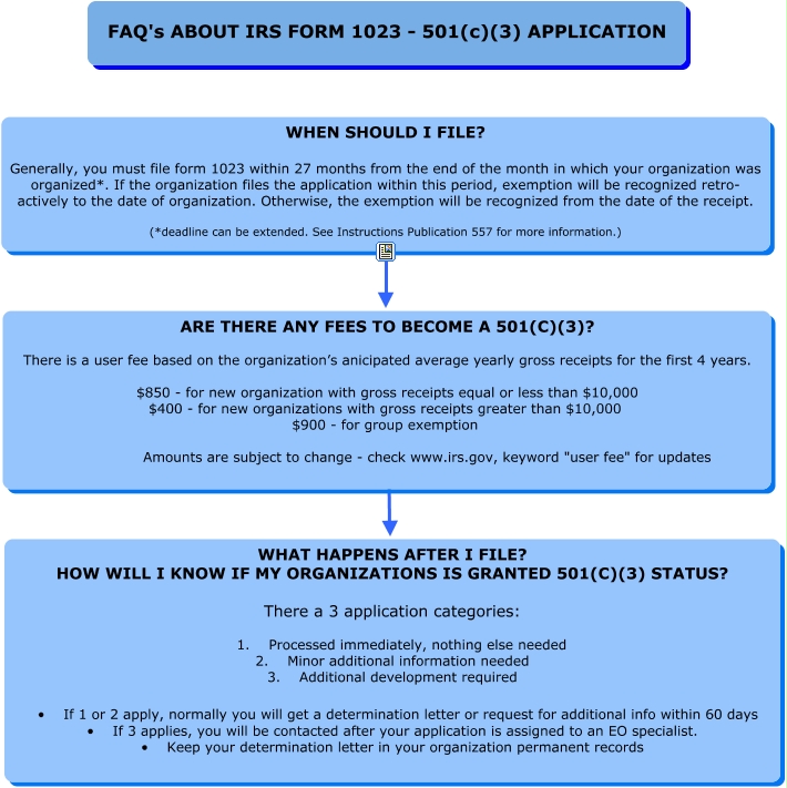 This Concept Map, created with IHMC CmapTools, has information related to: FAQs (IRS form 1023) Map - Final, WHEN SHOULD I FILE? Generally, you must file form 1023 within 27 months from the end of the month in which your organization was organized*. If the organization files the application within this period, exemption will be recognized retro- actively to the date of organization. Otherwise, the exemption will be recognized from the date of the receipt. (*deadline can be extended. See Instructions Publication 557 for more information.) ???? ARE THERE ANY FEES TO BECOME A 501(C)(3)? There is a user fee based on the organization’s anicipated average yearly gross receipts for the first 4 years. $850 - for new organization with gross receipts equal or less than $10,000 $400 - for new organizations with gross receipts greater than $10,000 $900 - for group exemption Amounts are subject to change - check www.irs.gov, keyword "user fee" for updates, ARE THERE ANY FEES TO BECOME A 501(C)(3)? There is a user fee based on the organization’s anicipated average yearly gross receipts for the first 4 years. $850 - for new organization with gross receipts equal or less than $10,000 $400 - for new organizations with gross receipts greater than $10,000 $900 - for group exemption Amounts are subject to change - check www.irs.gov, keyword "user fee" for updates ???? WHAT HAPPENS AFTER I FILE? HOW WILL I KNOW IF MY ORGANIZATIONS IS GRANTED 501(C)(3) STATUS? There a 3 application categories: 1. Processed immediately, nothing else needed 2. Minor additional information needed 3. Additional development required • If 1 or 2 apply, normally you will get a determination letter or request for additional info within 60 days • If 3 applies, you will be contacted after your application is assigned to an EO specialist. • Keep your determination letter in your organization permanent records