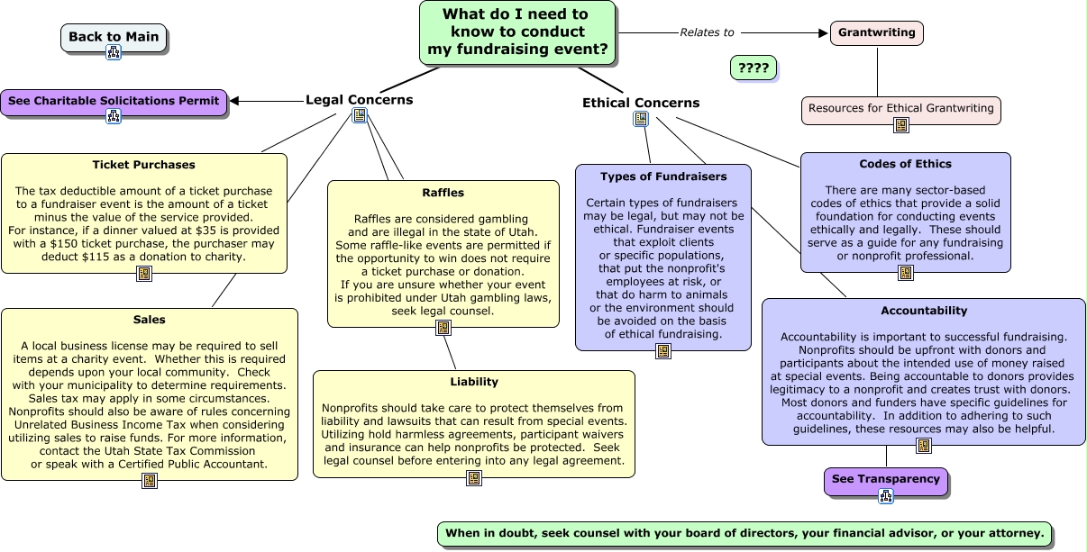 This Concept Map, created with IHMC CmapTools, has information related to: Fundraising Events, Grantwriting ???? Resources for Ethical Grantwriting, What do I need to know to conduct my fundraising event? Ethical Concerns Accountability Accountability is important to successful fundraising. Nonprofits should be upfront with donors and participants about the intended use of money raised at special events. Being accountable to donors provides legitimacy to a nonprofit and creates trust with donors. Most donors and funders have specific guidelines for accountability. In addition to adhering to such guidelines, these resources may also be helpful., What do I need to know to conduct my fundraising event? Legal Concerns Liability Nonprofits should take care to protect themselves from liability and lawsuits that can result from special events. Utilizing hold harmless agreements, participant waivers and insurance can help nonprofits be protected. Seek legal counsel before entering into any legal agreement., What do I need to know to conduct my fundraising event? Ethical Concerns Types of Fundraisers Certain types of fundraisers may be legal, but may not be ethical. Fundraiser events that exploit clients or specific populations, that put the nonprofit's employees at risk, or that do harm to animals or the environment should be avoided on the basis of ethical fundraising., Codes of Ethics There are many sector-based codes of ethics that provide a solid foundation for conducting events ethically and legally. These should serve as a guide for any fundraising or nonprofit professional. Ethical Concerns Accountability Accountability is important to successful fundraising. Nonprofits should be upfront with donors and participants about the intended use of money raised at special events. Being accountable to donors provides legitimacy to a nonprofit and creates trust with donors. Most donors and funders have specific guidelines for accountability. In addition to adhering to such guidelines, these resources may also be helpful., What do I need to know to conduct my fundraising event? Legal Concerns See Charitable Solicitations Permit, What do I need to know to conduct my fundraising event? Legal Concerns Raffles Raffles are considered gambling and are illegal in the state of Utah. Some raffle-like events are permitted if the opportunity to win does not require a ticket purchase or donation. If you are unsure whether your event is prohibited under Utah gambling laws, seek legal counsel., What do I need to know to conduct my fundraising event? Legal Concerns Ticket Purchases The tax deductible amount of a ticket purchase to a fundraiser event is the amount of a ticket minus the value of the service provided. For instance, if a dinner valued at $35 is provided with a $150 ticket purchase, the purchaser may deduct $115 as a donation to charity., Accountability Accountability is important to successful fundraising. Nonprofits should be upfront with donors and participants about the intended use of money raised at special events. Being accountable to donors provides legitimacy to a nonprofit and creates trust with donors. Most donors and funders have specific guidelines for accountability. In addition to adhering to such guidelines, these resources may also be helpful. ???? See Transparency, What do I need to know to conduct my fundraising event? Relates to Grantwriting, What do I need to know to conduct my fundraising event? Legal Concerns Sales A local business license may be required to sell items at a charity event. Whether this is required depends upon your local community. Check with your municipality to determine requirements. Sales tax may apply in some circumstances. Nonprofits should also be aware of rules concerning Unrelated Business Income Tax when considering utilizing sales to raise funds. For more information, contact the Utah State Tax Commission or speak with a Certified Public Accountant., Codes of Ethics There are many sector-based codes of ethics that provide a solid foundation for conducting events ethically and legally. These should serve as a guide for any fundraising or nonprofit professional. Ethical Concerns Types of Fundraisers Certain types of fundraisers may be legal, but may not be ethical. Fundraiser events that exploit clients or specific populations, that put the nonprofit's employees at risk, or that do harm to animals or the environment should be avoided on the basis of ethical fundraising.