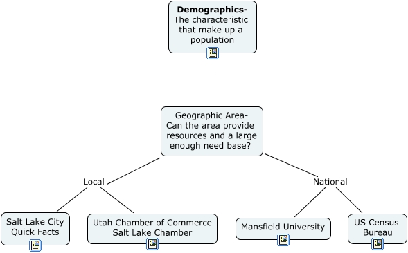 This Concept Map, created with IHMC CmapTools, has information related to: Demo submap, Demographics- The characteristic that make up a population Geographic Area- Can the area provide resources and a large enough need base?, Geographic Area- Can the area provide resources and a large enough need base? Local Utah Chamber of Commerce Salt Lake Chamber, Geographic Area- Can the area provide resources and a large enough need base? Local Salt Lake City Quick Facts, Geographic Area- Can the area provide resources and a large enough need base? National Mansfield University, Geographic Area- Can the area provide resources and a large enough need base? National US Census Bureau