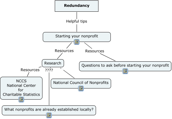 This Concept Map, created with IHMC CmapTools, has information related to: Redundancy, Research Resources NCCS National Center for Charitable Statistics, Research National Council of Nonprofits, Starting your nonprofit Resources Questions to ask before starting your nonprofit, Starting your nonprofit Resources Research, Redundancy Helpful tips Starting your nonprofit, Research ???? What nonprofits are already established locally?