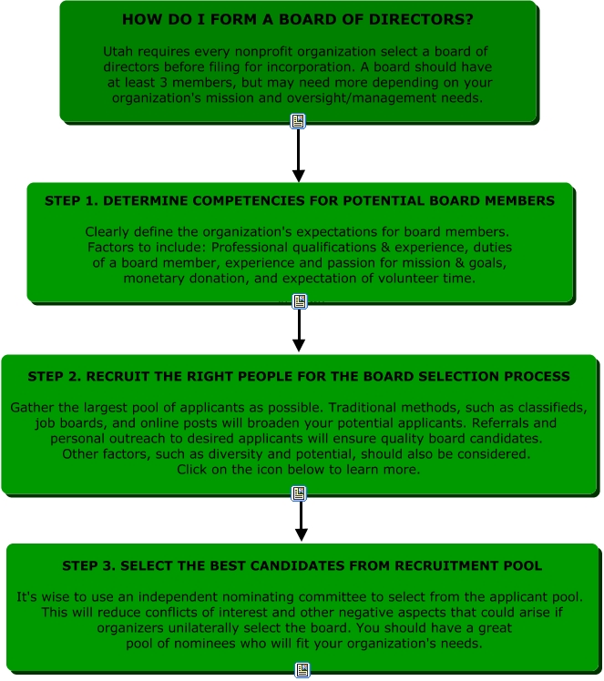 This Concept Map, created with IHMC CmapTools, has information related to: Board Development - Final, HOW DO I FORM A BOARD OF DIRECTORS? Utah requires every nonprofit organization select a board of directors before filing for incorporation. A board should have at least 3 members, but may need more depending on your organization's mission and oversight/management needs. ???? ????, STEP 2. RECRUIT THE RIGHT PEOPLE FOR THE BOARD SELECTION PROCESS Gather the largest pool of applicants as possible. Traditional methods, such as classifieds, job boards, and online posts will broaden your potential applicants. Referrals and personal outreach to desired applicants will ensure quality board candidates. Other factors, such as diversity and potential, should also be considered. Click on the icon below to learn more. Step Three STEP 3. SELECT THE BEST CANDIDATES FROM RECRUITMENT POOL It's wise to use an independent nominating committee to select from the applicant pool. This will reduce conflicts of interest and other negative aspects that could arise if organizers unilaterally select the board. You should have a great pool of nominees who will fit your organization's needs., STEP 1. DETERMINE COMPETENCIES FOR POTENTIAL BOARD MEMBERS Clearly define the organization's expectations for board members. Factors to include: Professional qualifications & experience, duties of a board member, experience and passion for mission & goals, monetary donation, and expectation of volunteer time. Step Two STEP 2. RECRUIT THE RIGHT PEOPLE FOR THE BOARD SELECTION PROCESS Gather the largest pool of applicants as possible. Traditional methods, such as classifieds, job boards, and online posts will broaden your potential applicants. Referrals and personal outreach to desired applicants will ensure quality board candidates. Other factors, such as diversity and potential, should also be considered. Click on the icon below to learn more.