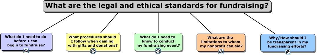 This Concept Map, created with IHMC CmapTools, has information related to: Fundraising Major, What procedures should I follow when dealing with gifts and donations? ???? What are the legal and ethical standards for fundraising?, What are the legal and ethical standards for fundraising? ???? What do I need to know to conduct my fundraising event?, What do I need to do before I can begin to fundraise? ???? What are the legal and ethical standards for fundraising?, What are the legal and ethical standards for fundraising? ???? Why/How should I be transparent in my fundraising efforts?, What are the legal and ethical standards for fundraising? ???? What are the limitations to whom my nonprofit can aid?