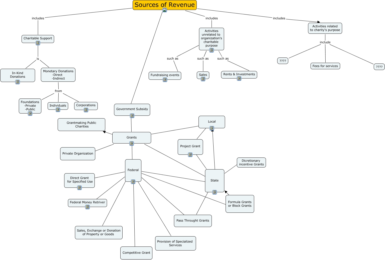 This Concept Map, created with IHMC CmapTools, has information related to: Untitled, Monetary Donations -Direct -Indirect from Foundations -Private -Public, Grants ???? Grantmaking Public Charities, Sources of Revenue ???? ????, Activities unrelated to organization's charitable purpose such as Sales, Project Grant ???? State, Federal ???? Pass Throught Grants, Pass Throught Grants ???? State, Sources of Revenue includes Activities related to charity's purpose, Local ???? Project Grant, Monetary Donations -Direct -Indirect from Corporations, Grants ???? Private Organization, Activities related to charity's purpose include ????, Activities unrelated to organization's charitable purpose such as Fundraising events, Activities unrelated to organization's charitable purpose such as Rents & Investments, Charitable Support is In-Kind Donations, Grants ???? State, Sources of Revenue includes Activities unrelated to organization's charitable purpose, Federal ???? Sales, Exchange or Donation of Property or Goods, Federal ???? Formula Grants or Block Grants, Grants ???? Government Subsidy