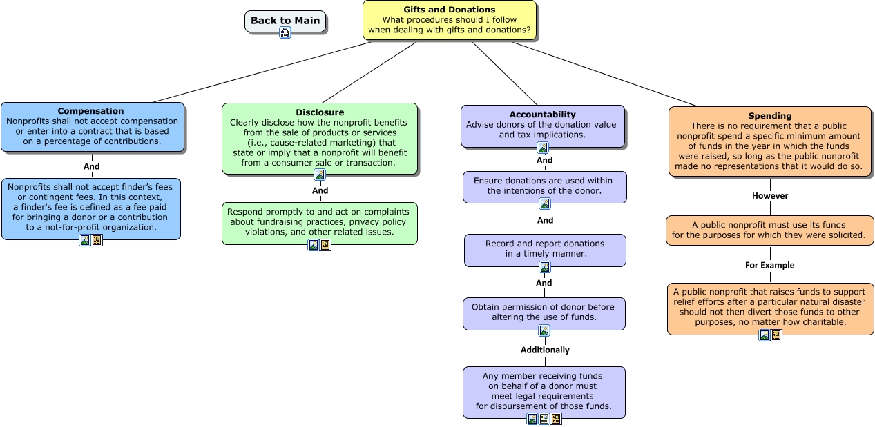 This Concept Map, created with IHMC CmapTools, has information related to: Gifts and Donations, Accountability Advise donors of the donation value and tax implications. And Ensure donations are used within the intentions of the donor., Gifts and Donations What procedures should I follow when dealing with gifts and donations? ???? Disclosure Clearly disclose how the nonprofit benefits from the sale of products or services (i.e., cause-related marketing) that state or imply that a nonprofit will benefit from a consumer sale or transaction., Gifts and Donations What procedures should I follow when dealing with gifts and donations? ???? Compensation Nonprofits shall not accept compensation or enter into a contract that is based on a percentage of contributions., Obtain permission of donor before altering the use of funds. Additionally Any member receiving funds on behalf of a donor must meet legal requirements for disbursement of those funds., Gifts and Donations What procedures should I follow when dealing with gifts and donations? ???? Accountability Advise donors of the donation value and tax implications., Compensation Nonprofits shall not accept compensation or enter into a contract that is based on a percentage of contributions. And Nonprofits shall not accept finder’s fees or contingent fees. In this context, a finder's fee is defined as a fee paid for bringing a donor or a contribution to a not-for-profit organization., Ensure donations are used within the intentions of the donor. And Record and report donations in a timely manner., Gifts and Donations What procedures should I follow when dealing with gifts and donations? ???? Spending There is no requirement that a public nonprofit spend a specific minimum amount of funds in the year in which the funds were raised, so long as the public nonprofit made no representations that it would do so. , Disclosure Clearly disclose how the nonprofit benefits from the sale of products or services (i.e., cause-related marketing) that state or imply that a nonprofit will benefit from a consumer sale or transaction. And Respond promptly to and act on complaints about fundraising practices, privacy policy violations, and other related issues., A public nonprofit must use its funds for the purposes for which they were solicited. For Example A public nonprofit that raises funds to support relief efforts after a particular natural disaster should not then divert those funds to other purposes, no matter how charitable., Record and report donations in a timely manner. And Obtain permission of donor before altering the use of funds., Spending There is no requirement that a public nonprofit spend a specific minimum amount of funds in the year in which the funds were raised, so long as the public nonprofit made no representations that it would do so. However A public nonprofit must use its funds for the purposes for which they were solicited.