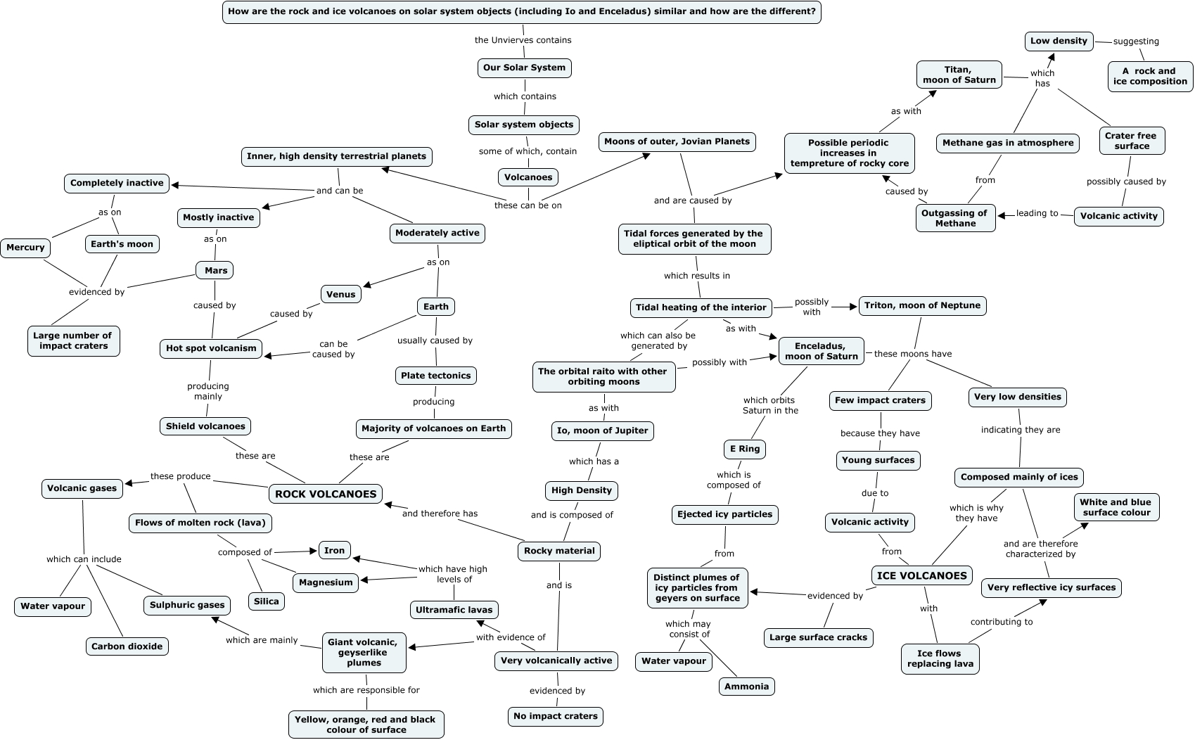 This Concept Map, created with IHMC CmapTools, has information related to: rock and ice volcanoes, Very volcanically active evidenced by No impact craters, ICE VOLCANOES evidenced by Distinct plumes of icy particles from geyers on surface, Giant volcanic, geyserlike plumes which are mainly Sulphuric gases, Titan, moon of Saturn which has Crater free surface, Tidal heating of the interior which can also be generated by The orbital raito with other orbiting moons, Inner, high density terrestrial planets and can be Mostly inactive, Moons of outer, Jovian Planets and are caused by Tidal forces generated by the eliptical orbit of the moon, How are the rock and ice volcanoes on solar system objects (including Io and Enceladus) similar and how are the different? the Unvierves contains Our Solar System, Triton, moon of Neptune these moons have Very low densities, Io, moon of Jupiter which has a High Density, Moderately active as on Venus, Flows of molten rock (lava) composed of Magnesium, Ultramafic lavas which have high levels of Magnesium, Distinct plumes of icy particles from geyers on surface which may consist of Water vapour, Low density suggesting A rock and ice composition, Hot spot volcanism producing mainly Shield volcanoes, Our Solar System which contains Solar system objects, Tidal heating of the interior as with Enceladus, moon of Saturn, Enceladus, moon of Saturn these moons have Few impact craters, Few impact craters because they have Young surfaces