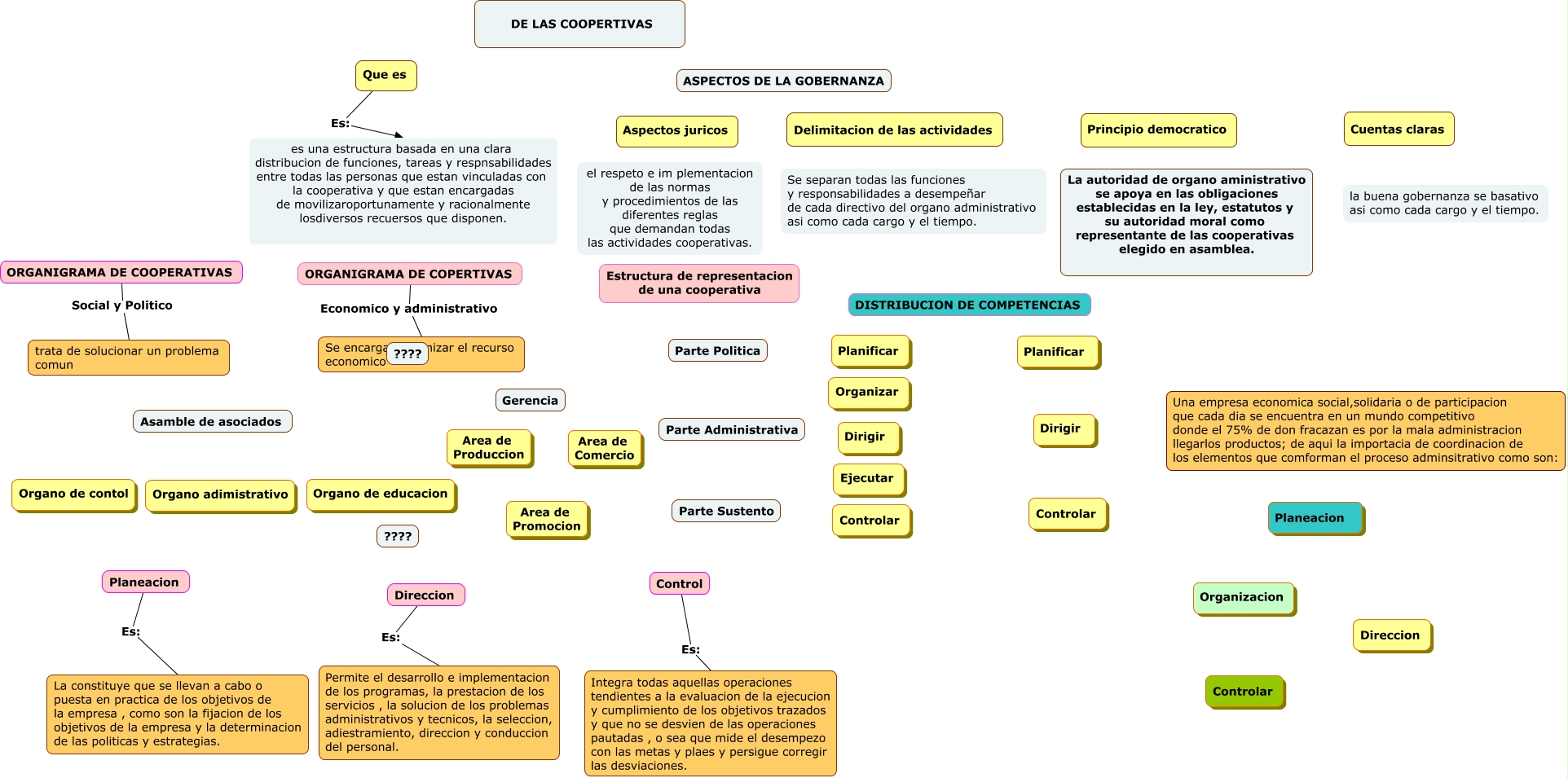 Este Cmap, tiene información relacionada con: gobernabilidad de las cooperativas, Control Es: Integra todas aquellas operaciones tendientes a la evaluacion de la ejecucion y cumplimiento de los objetivos trazados y que no se desvien de las operaciones pautadas , o sea que mide el desempezo con las metas y plaes y persigue corregir las desviaciones., Que es Es: es una estructura basada en una clara distribucion de funciones, tareas y respnsabilidades entre todas las personas que estan vinculadas con la cooperativa y que estan encargadas de movilizaroportunamente y racionalmente losdiversos recuersos que disponen., Se encarga de minizar el recurso economico ???? ????, ORGANIGRAMA DE COPERTIVAS Economico y administrativo Se encarga de minizar el recurso economico, Planeacion Es: La constituye que se llevan a cabo o puesta en practica de los objetivos de la empresa , como son la fijacion de los objetivos de la empresa y la determinacion de las politicas y estrategias., ORGANIGRAMA DE COOPERATIVAS Social y Politico trata de solucionar un problema comun, Direccion Es: Permite el desarrollo e implementacion de los programas, la prestacion de los servicios , la solucion de los problemas administrativos y tecnicos, la seleccion, adiestramiento, direccion y conduccion del personal.